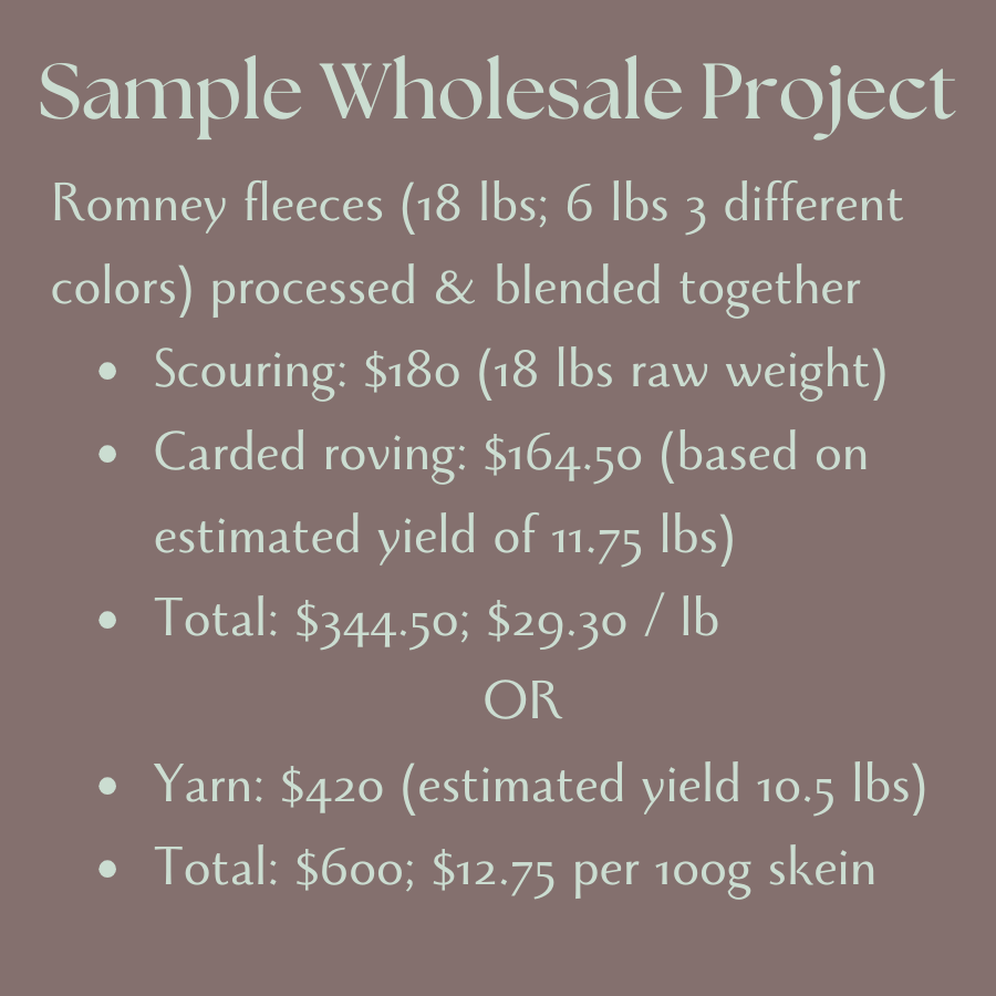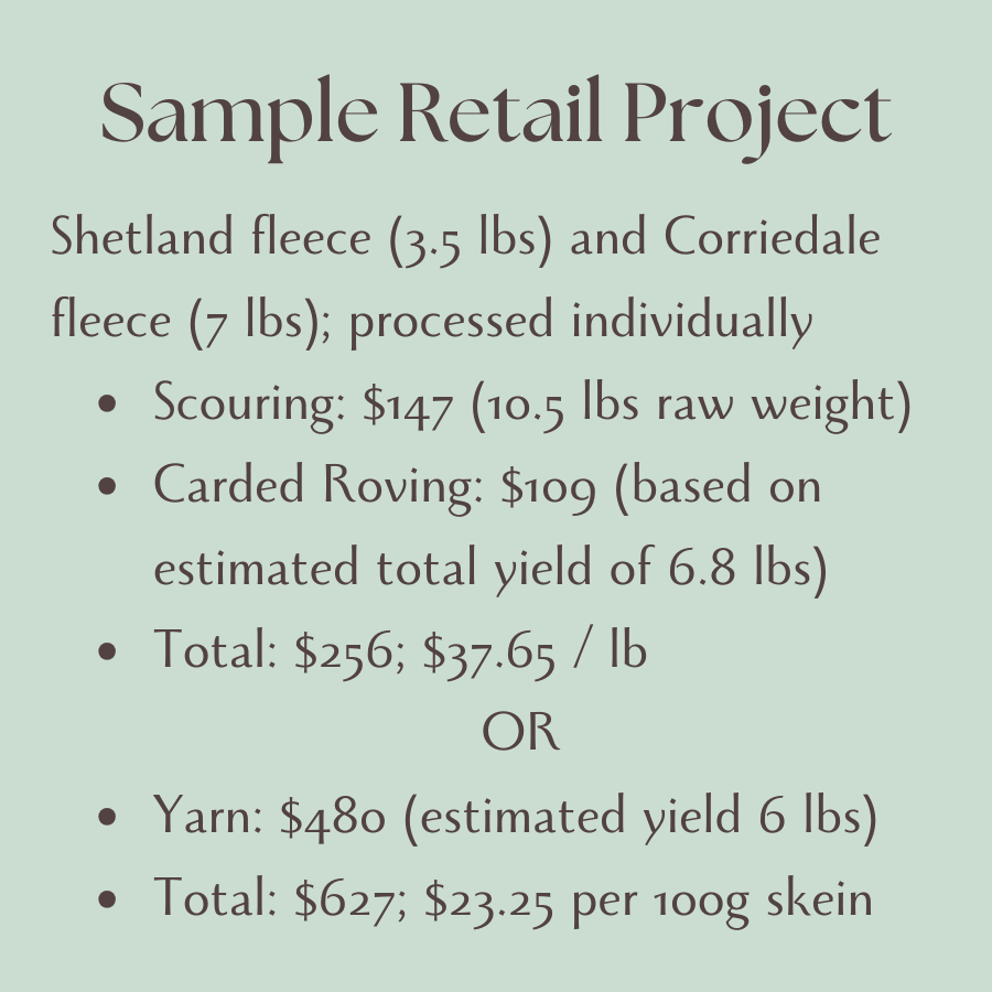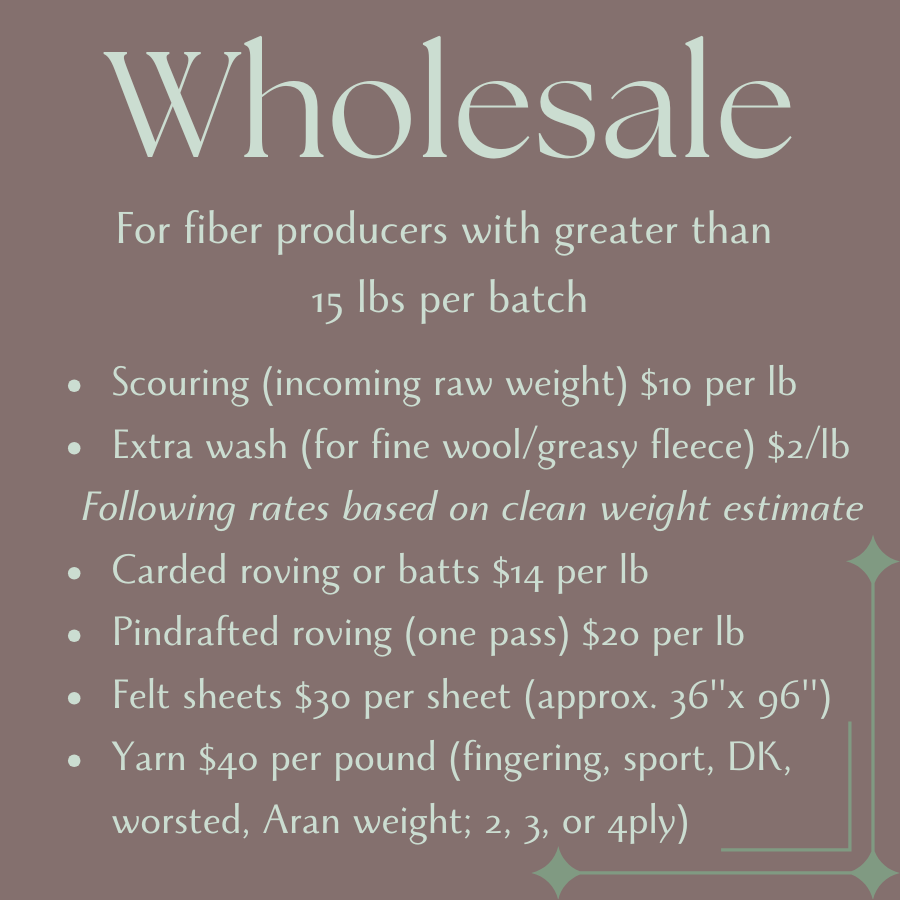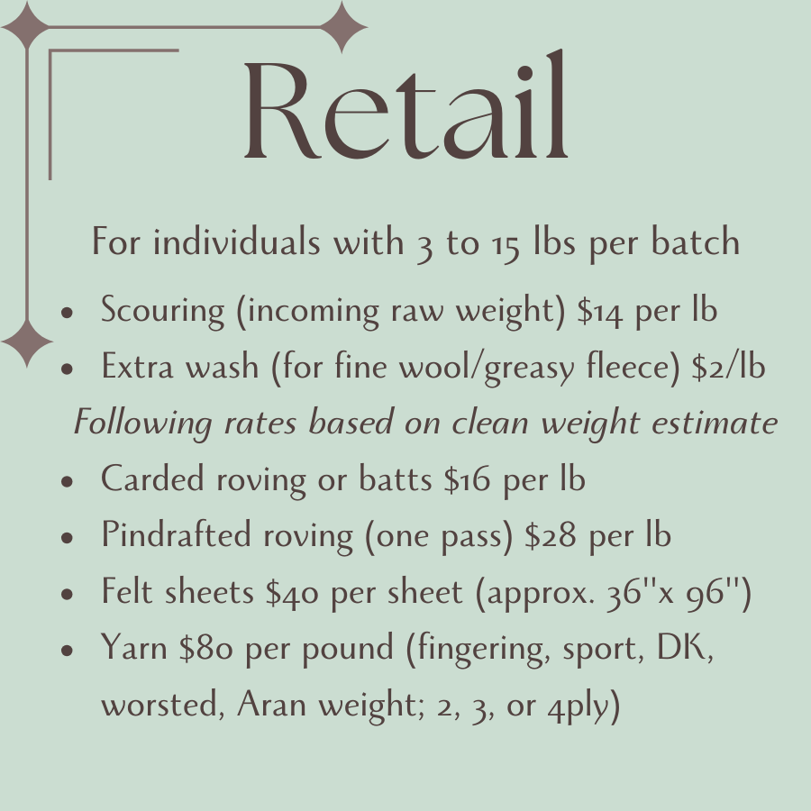We're offering two sets of rates - retail, and wholesale. Retail is for end-users, with at least 3 lbs but less than 15 lbs per batch of fiber. You might have one or two fleeces that you'd like processed, and you aren't planning on reselling the end product. Wholesale is for fiber producers, farms, etc, with greater than 15 lbs per batch of fiber. You plan on reselling your products, and have a volume of fiber to process.