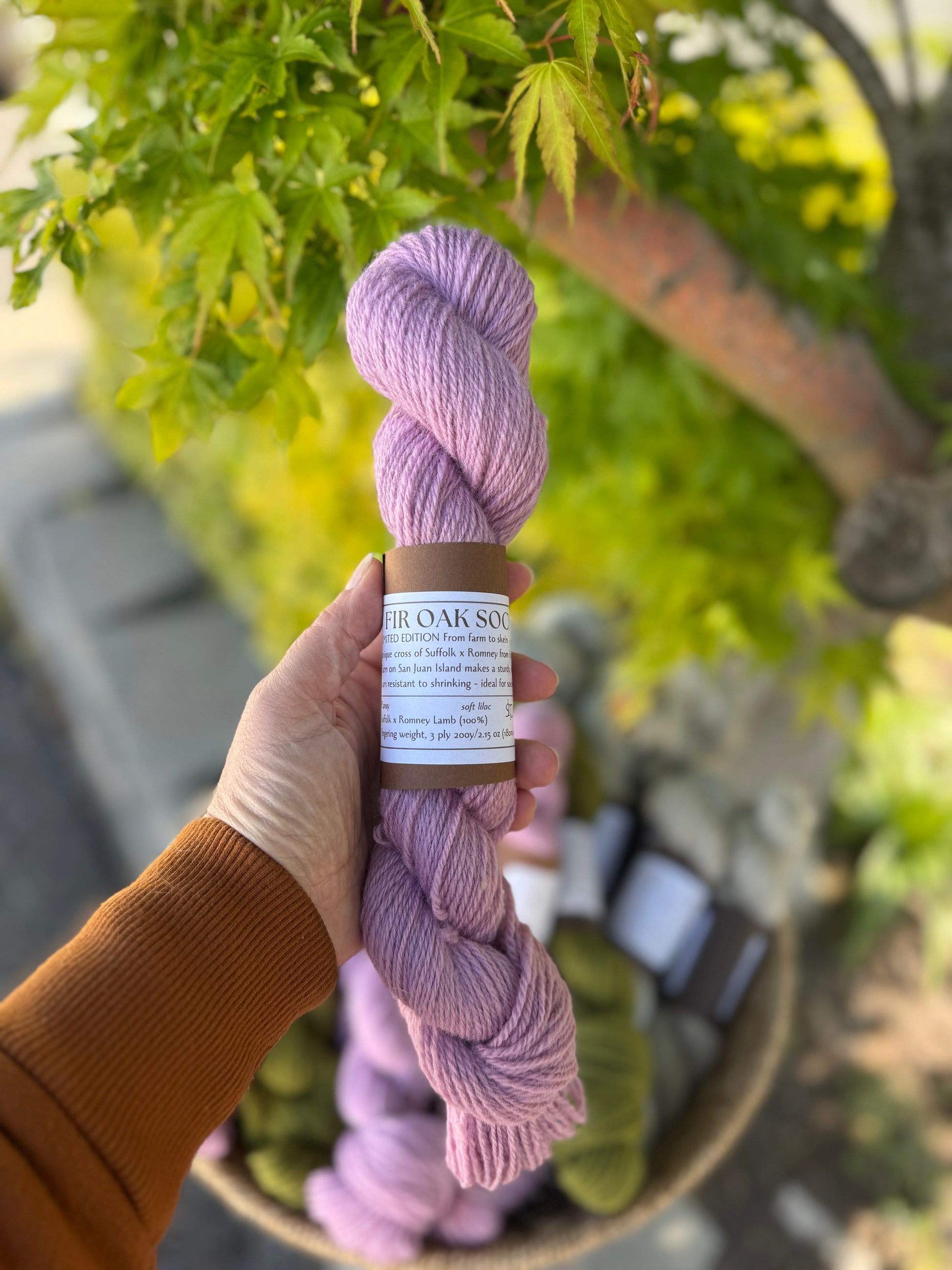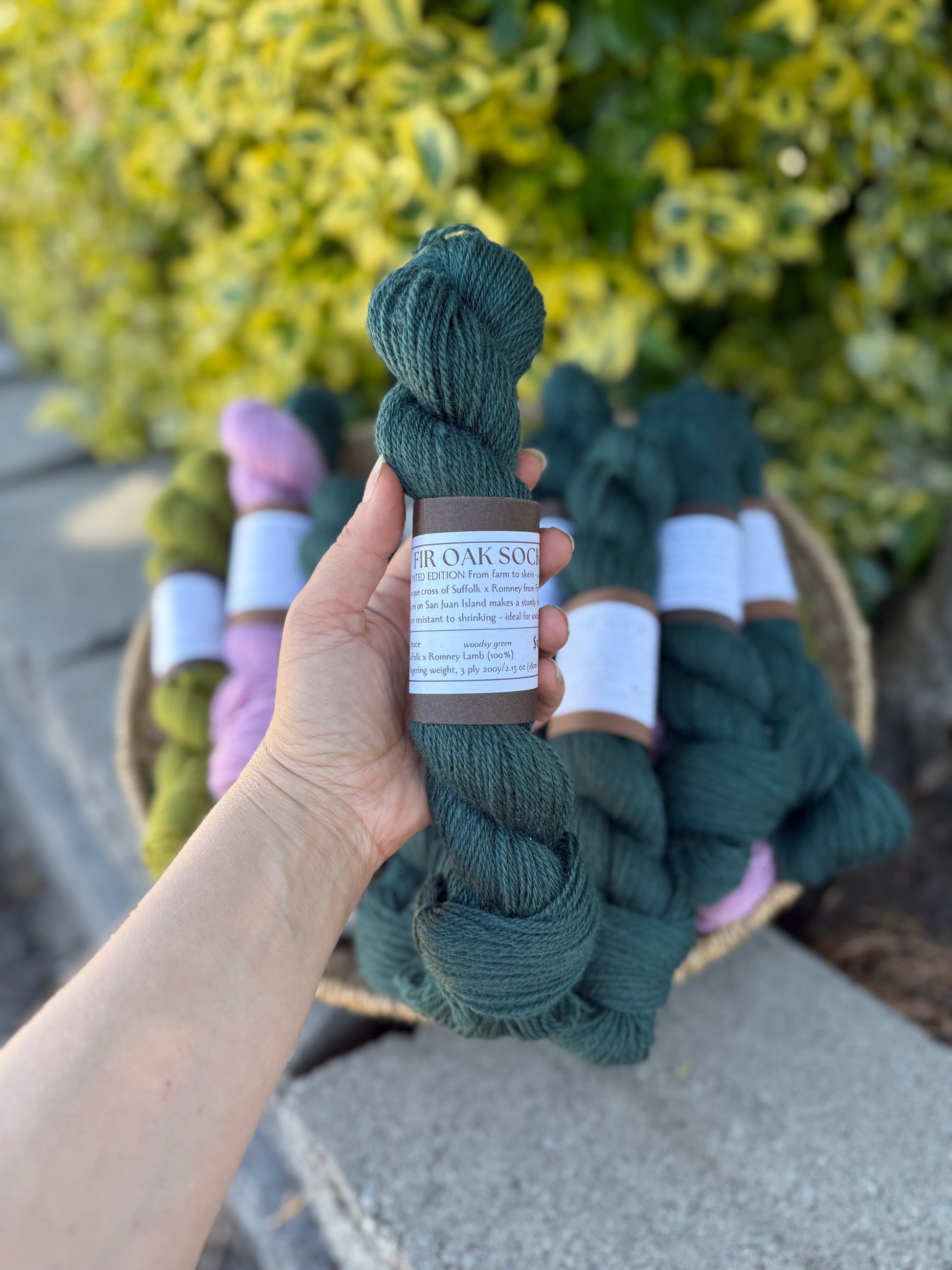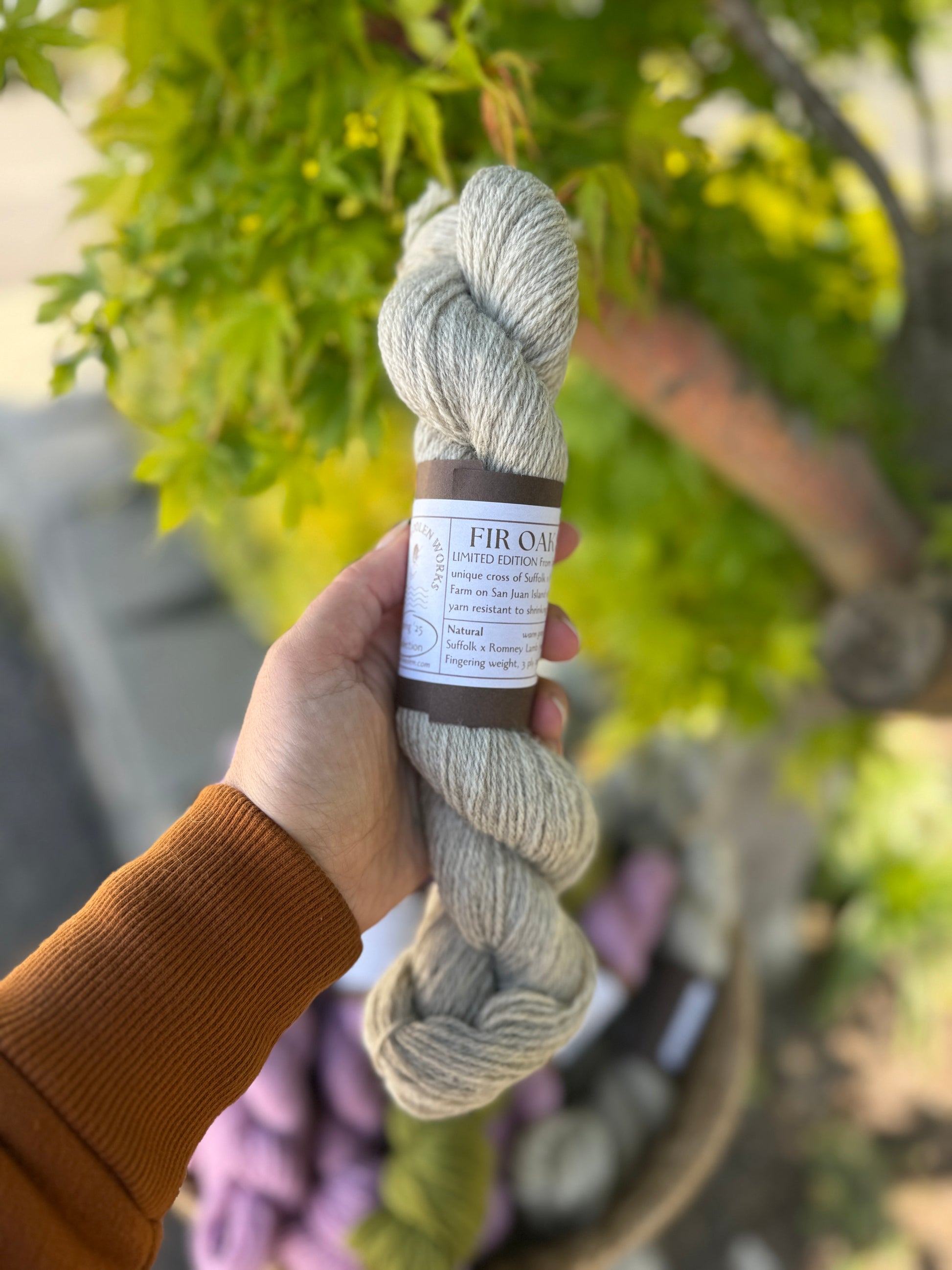 Limited Edition. From farm to skein - a unique cross of Suffolk x Romney hailing from Fir Oak Farm on San Juan Island. It's a sturdy, bouncy yarn resistent to felting - ideal for socks! Three colors: