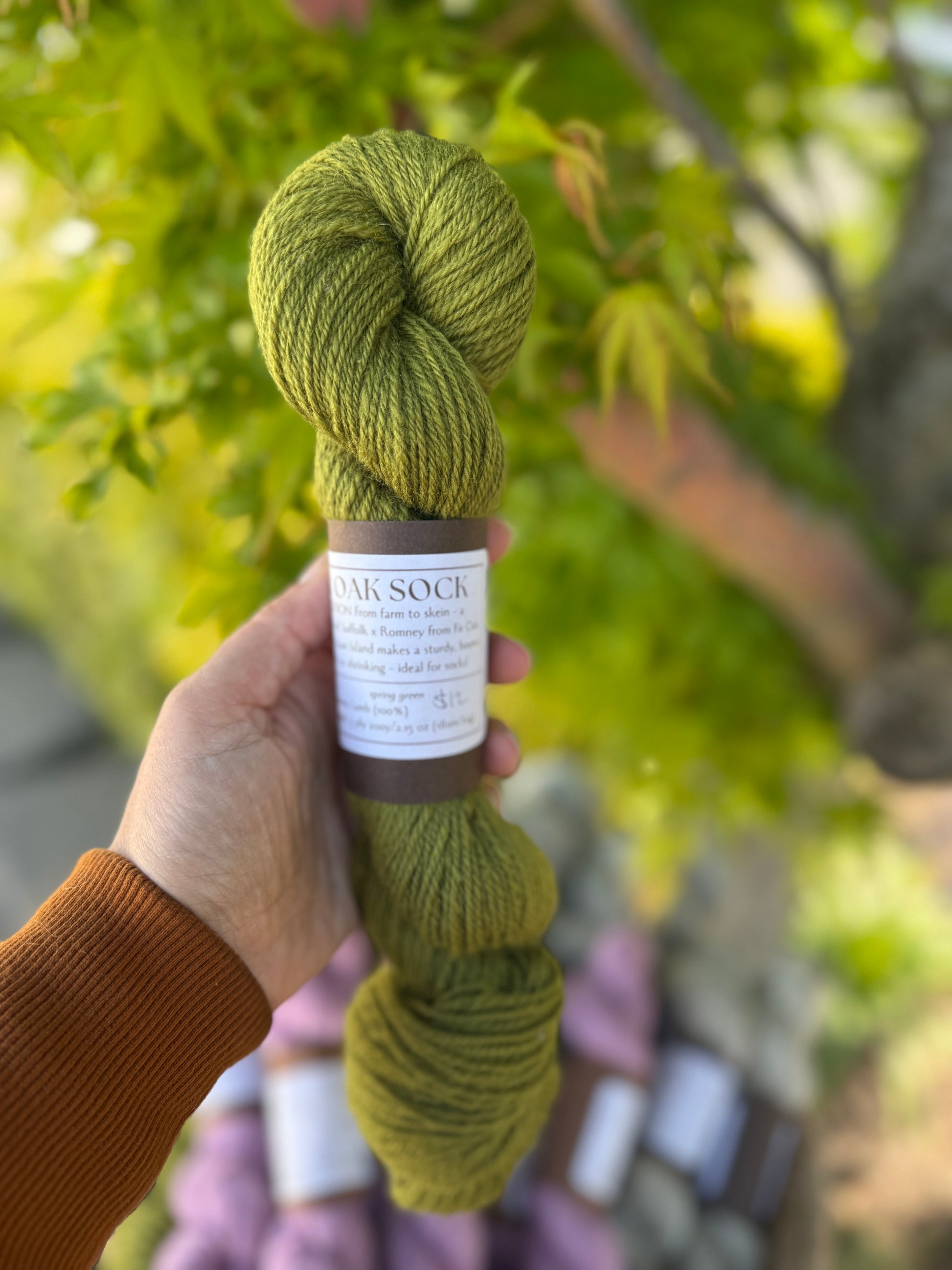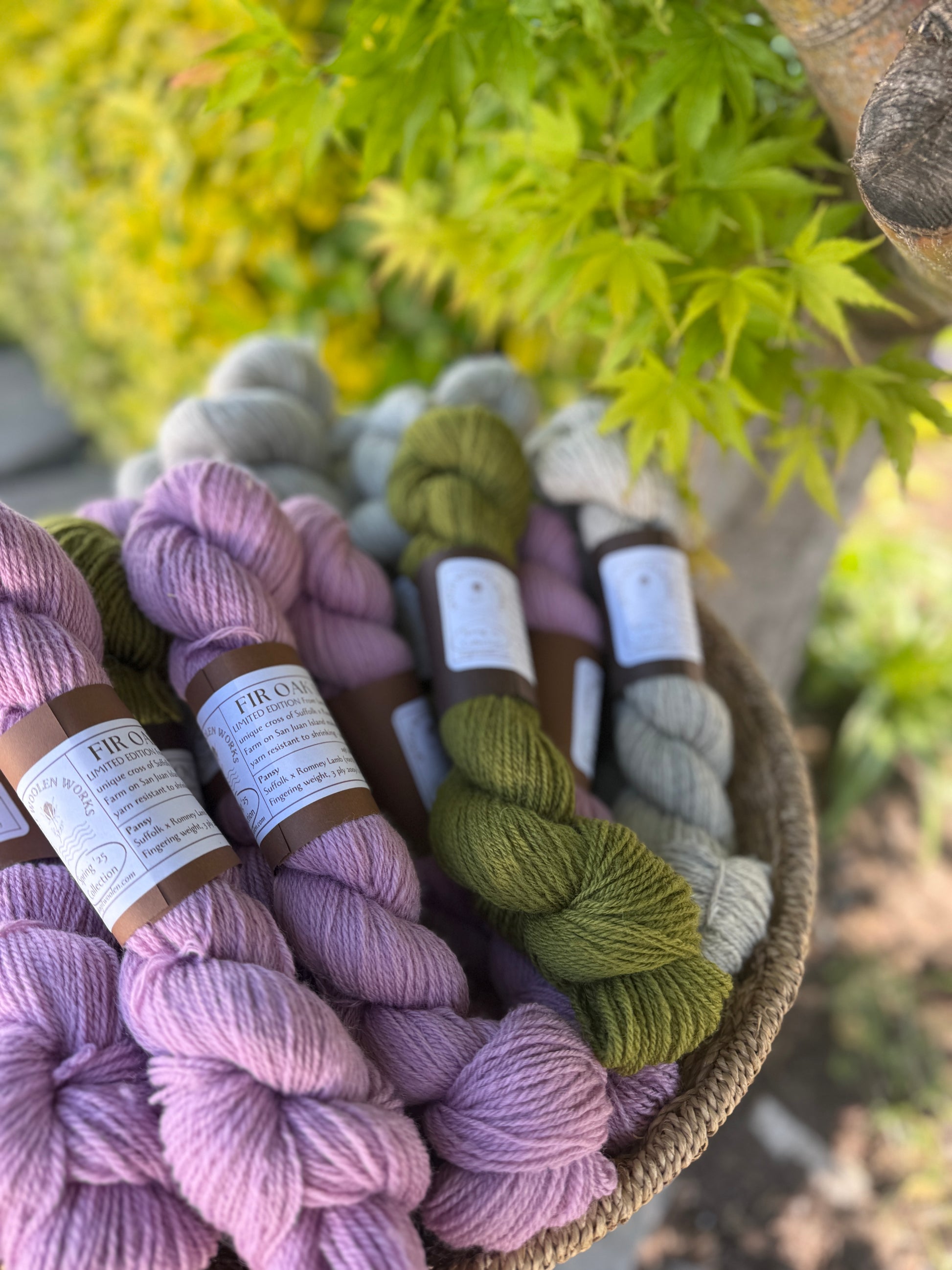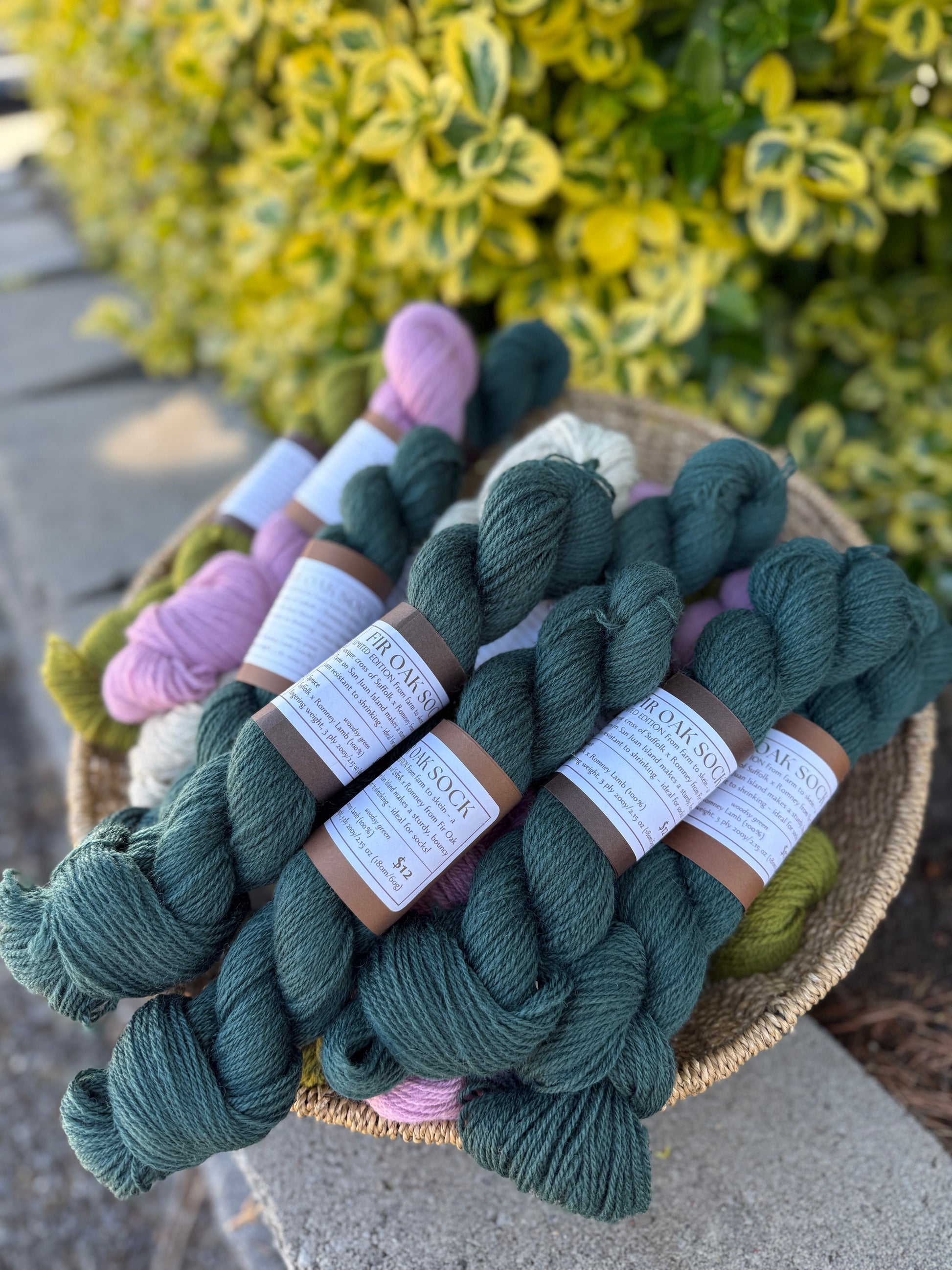 Limited Edition. From farm to skein - a unique cross of Suffolk x Romney hailing from Fir Oak Farm on San Juan Island. It's a sturdy, bouncy yarn resistent to felting - ideal for socks! Three colors: