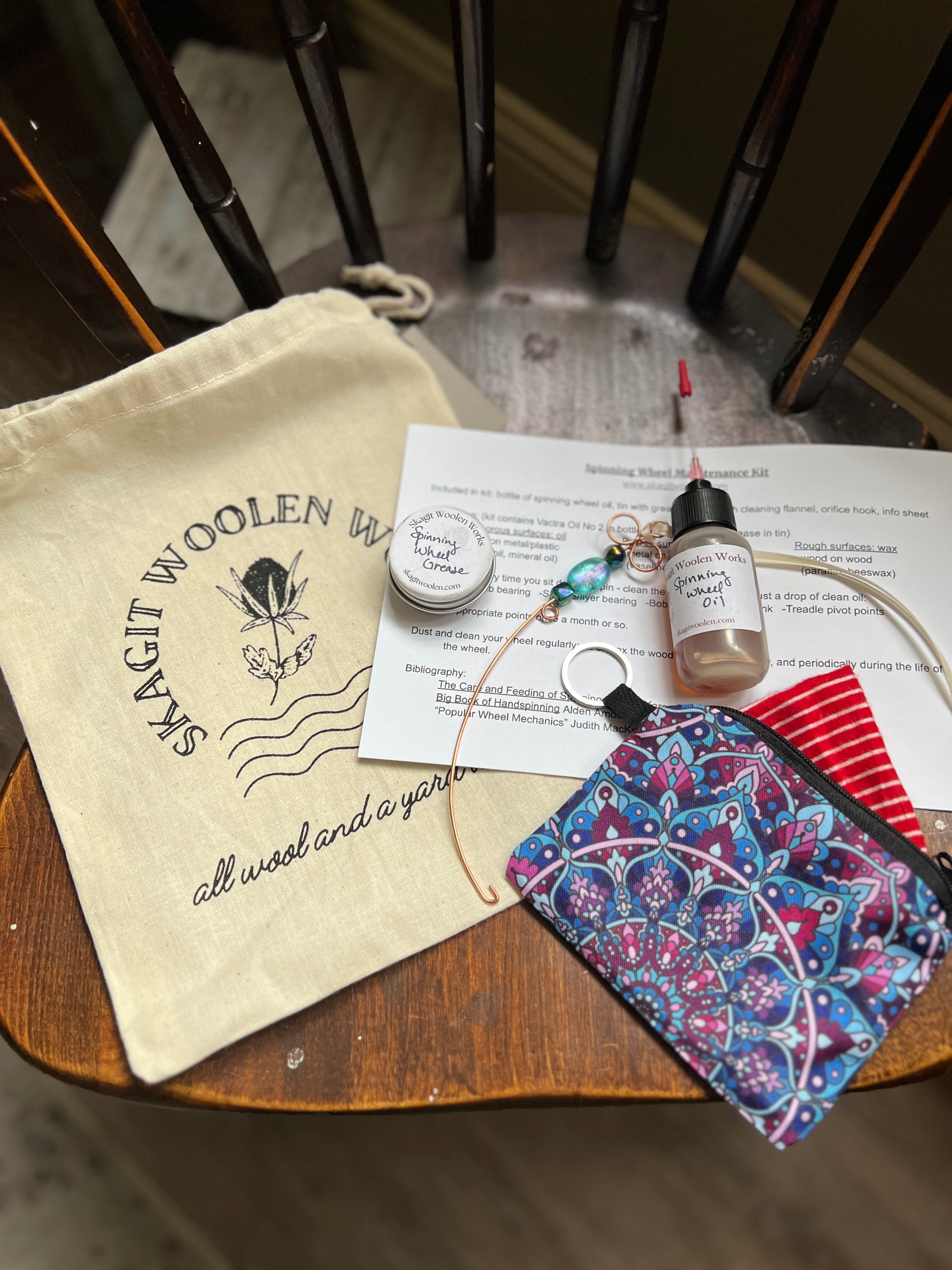 Includes a small amount of spinning wheel grease; spinning oil; handmade orifice hook; hemp drive band; small pouch with a piece of flannel; and spinning wheel maintenance info sheet. Comes inside a handy muslin pouch.