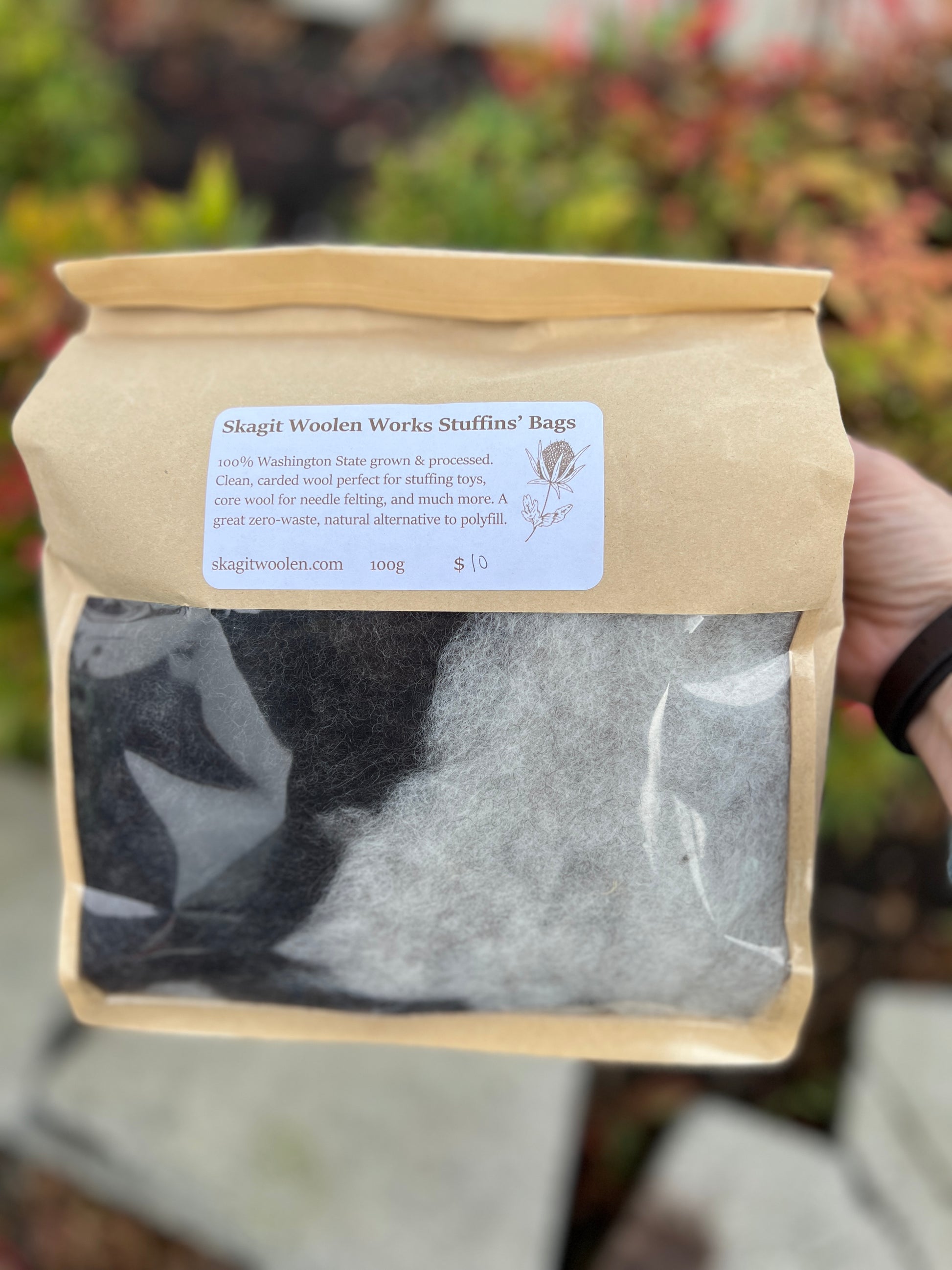 Clean & carded waste wool. Great zero-waste, all natural alternative to polyfill for stuffing (dolls, pet beds) or use as core wool for needle felting. 50g / $4 & 100g / $8 sizes.