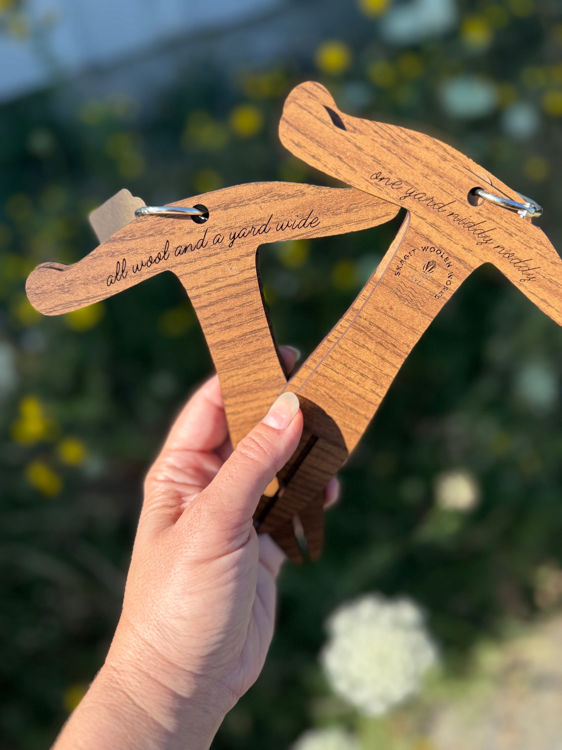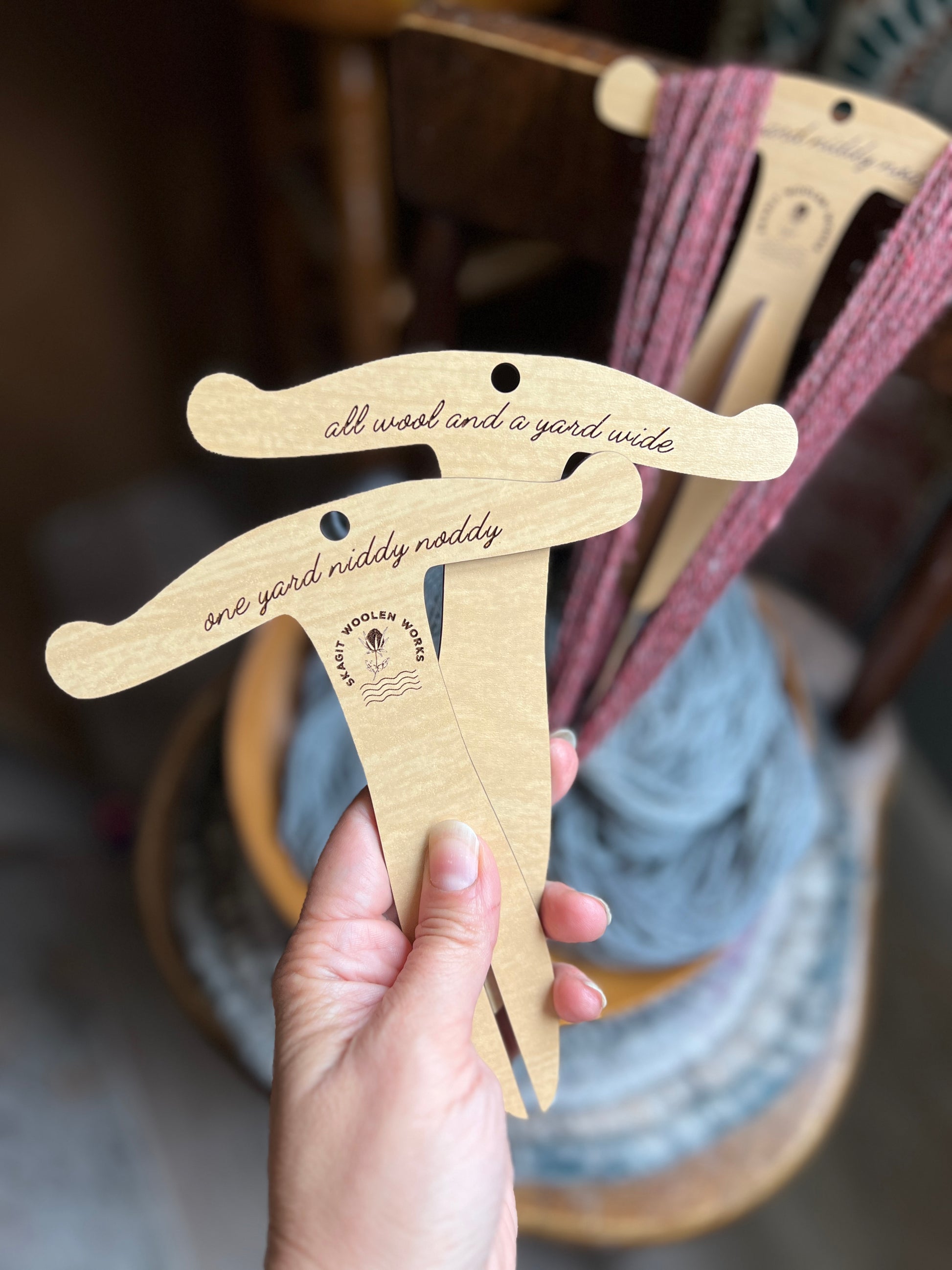 - One Yard Niddy Noddy - comes apart for easy transport, measuring off in one yard increments so you can measure your yarn on the go. Features our logo and motto 'all wool and a yard wide'. Original Birch and new Walnut!