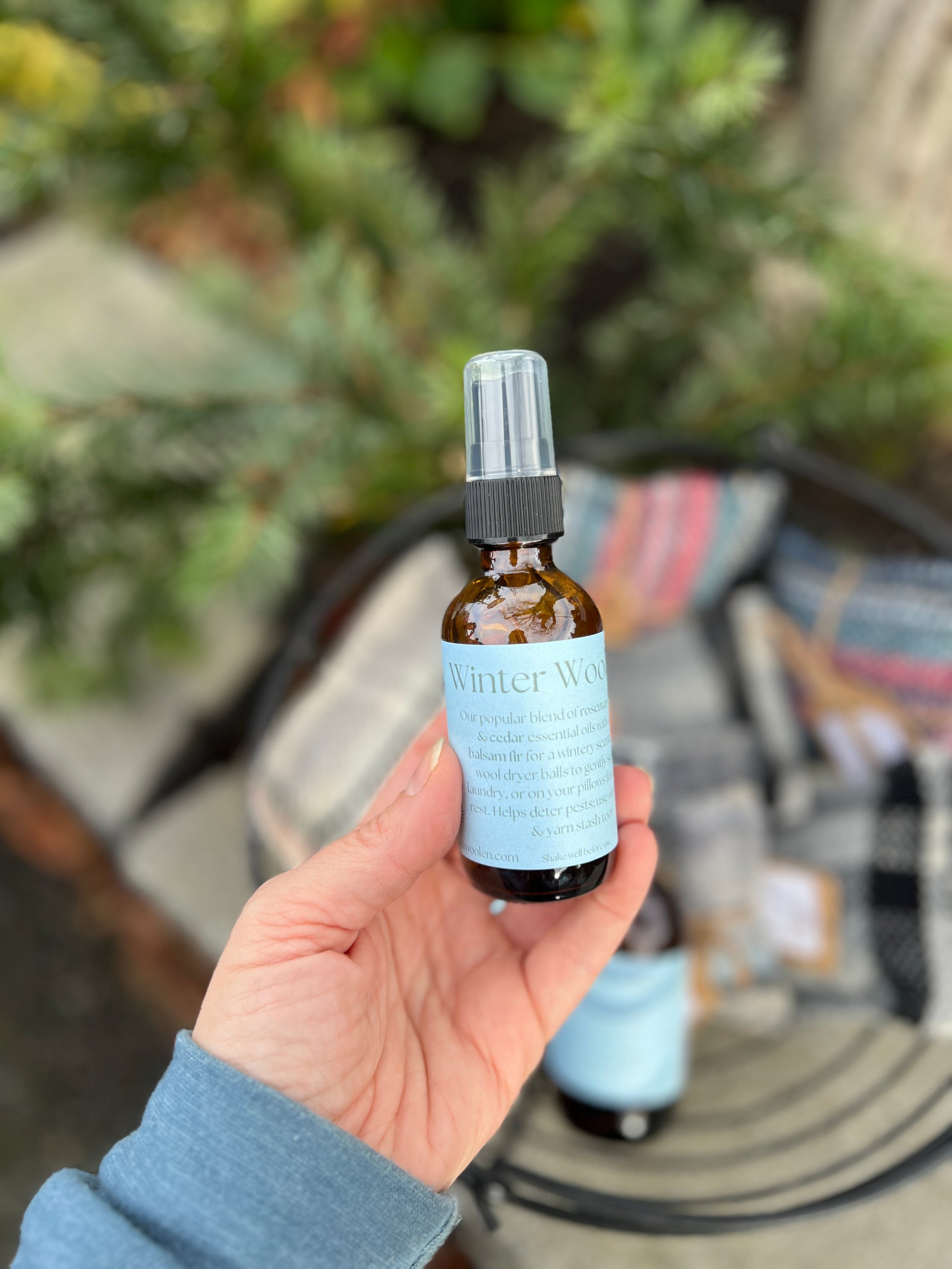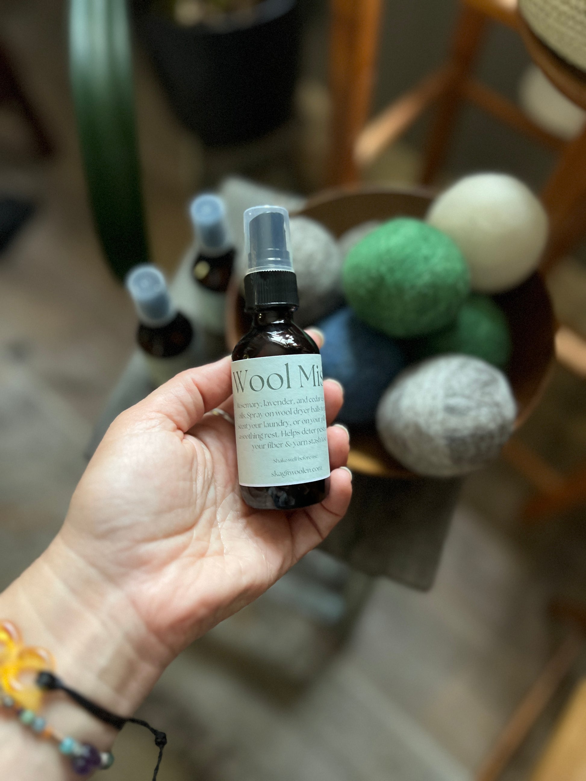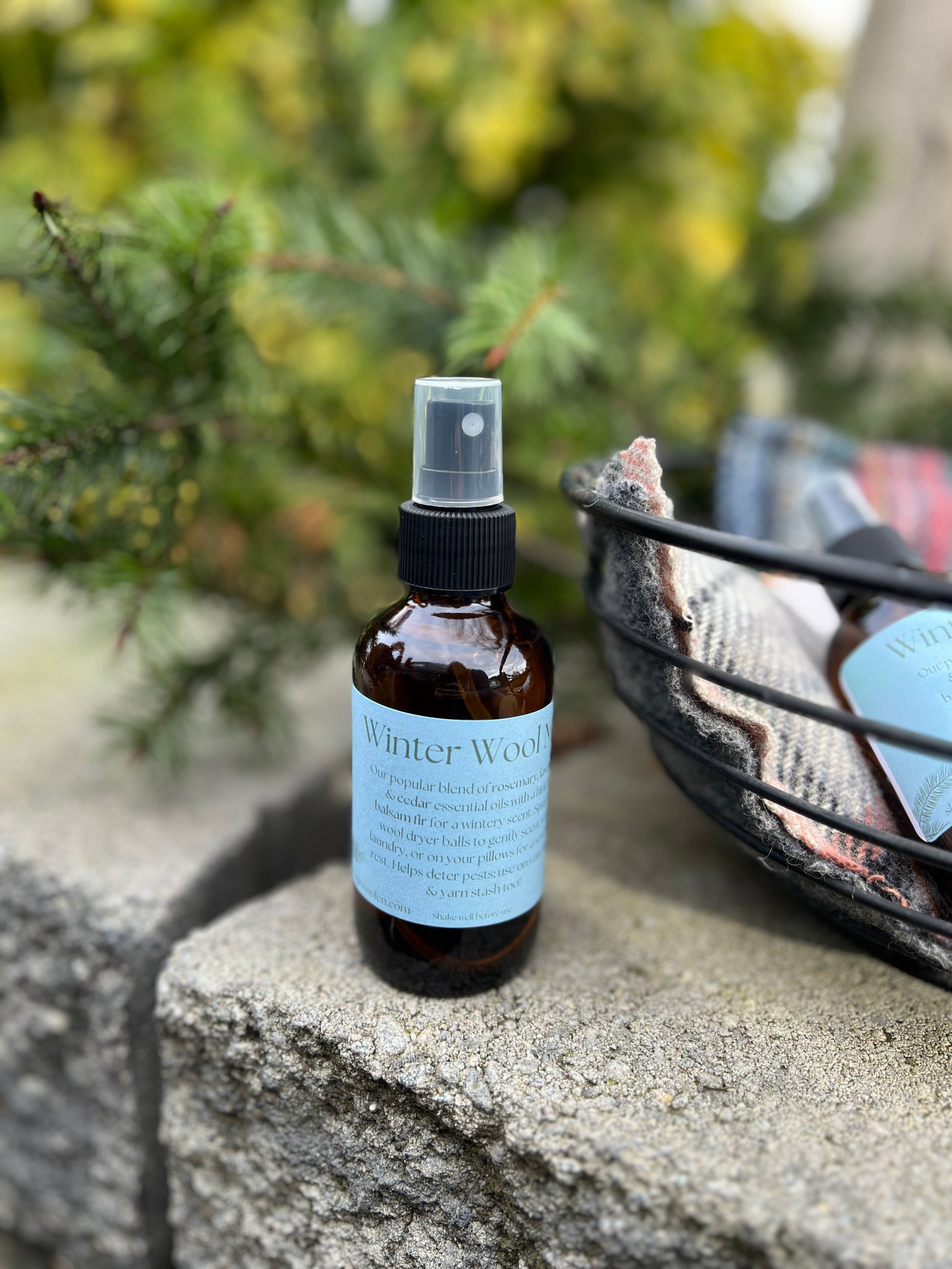 A soothing blend of Rosemary, Lavender, and Cedar essential oils. Spray on wool dryer balls to gently scent your laundry, or on your wool stuffed pillows for a soothing nights' rest. Helps deter pests, too; spray on your fiber and yarn stash for extra moth protection! 2oz & 4oz size, glass spray bottle.