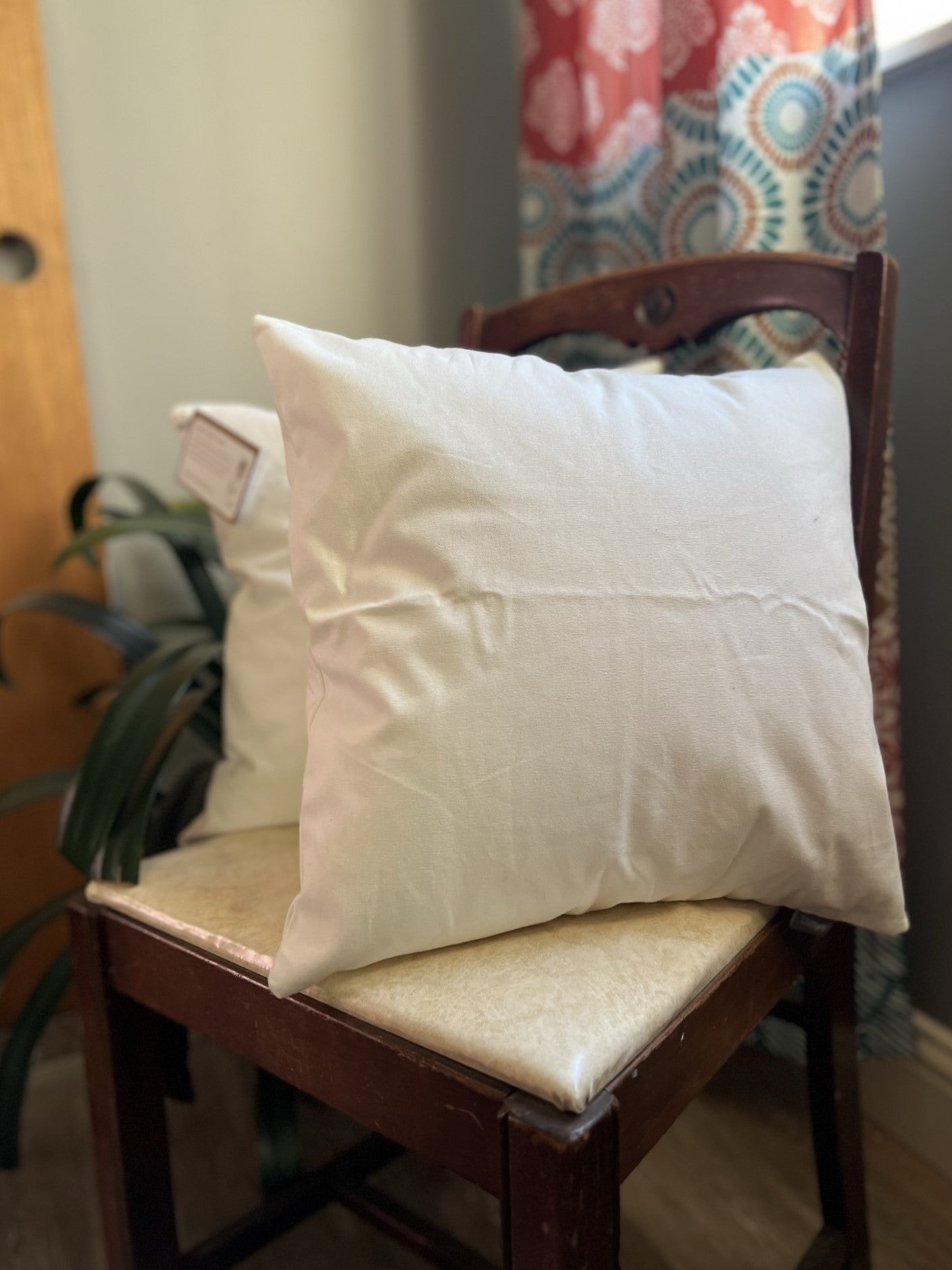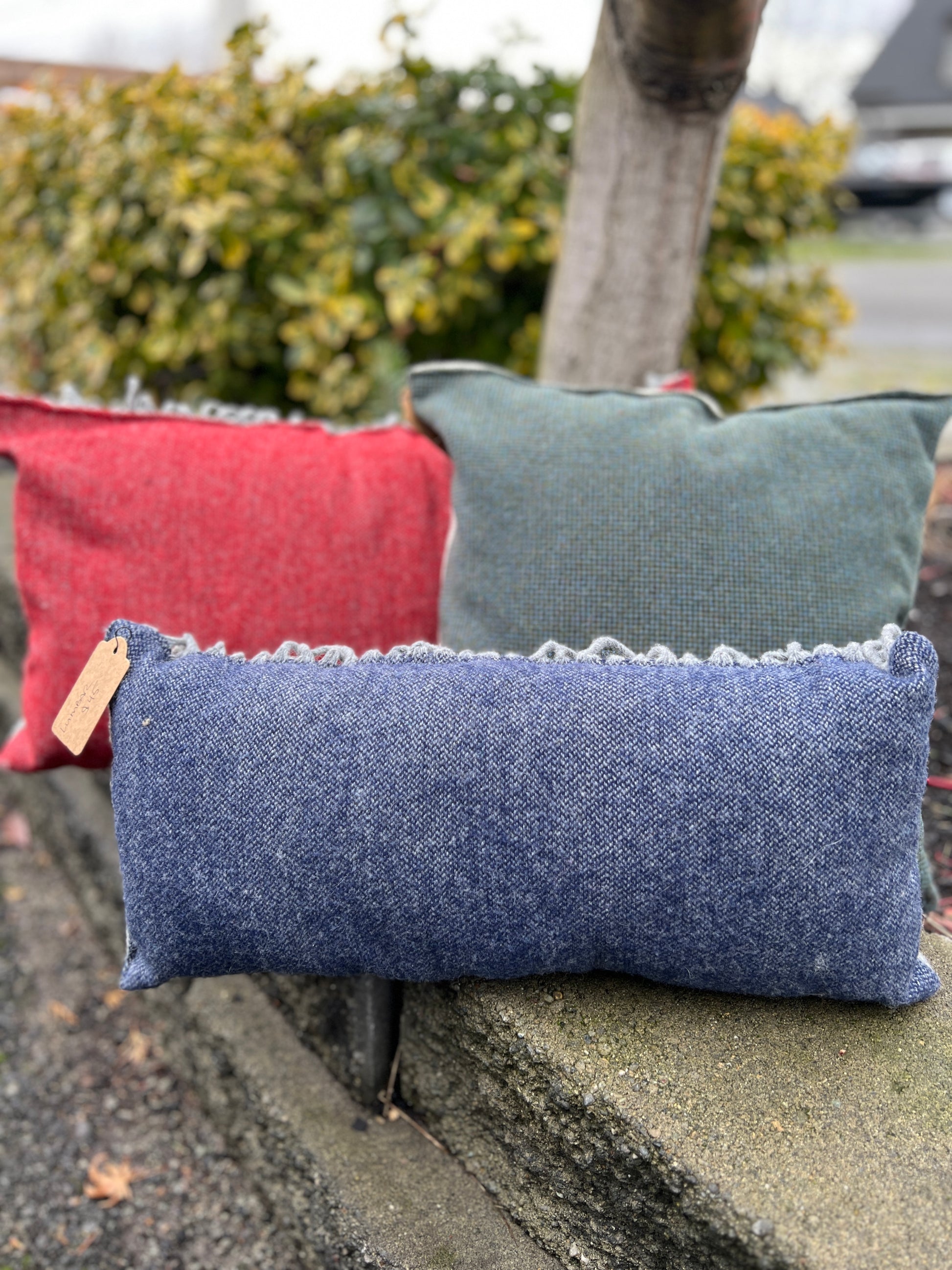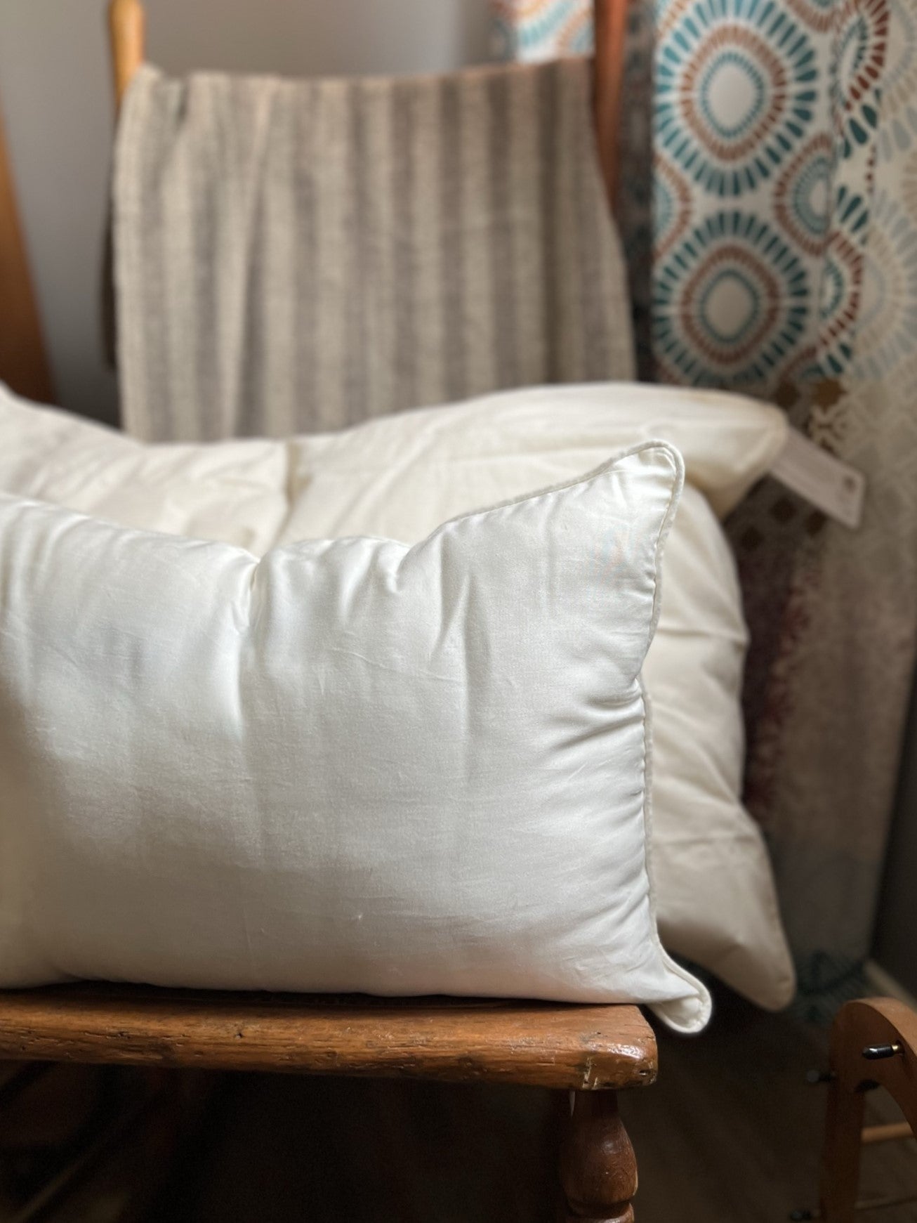 We take locally grown wool that is too short or tender for textiles, wash it with gentle, biodegradable soap, and card it to make our natural wool pillows. Because our wool is not carbonized, you may see bits of residual vegetation; we aim to keep this as minimal as possible. The wool batts, stuffed with clean core wool, are then scented with our special calming (and pest repelling) blend of essential oils (our popular wool mist!). We use an organic cotton slipcover for the standard size, which can be removed and machine washed when necessary. Three sizes currently available: Standard (20x26"); Square Throw (14x14"); Lumbar (12x20").