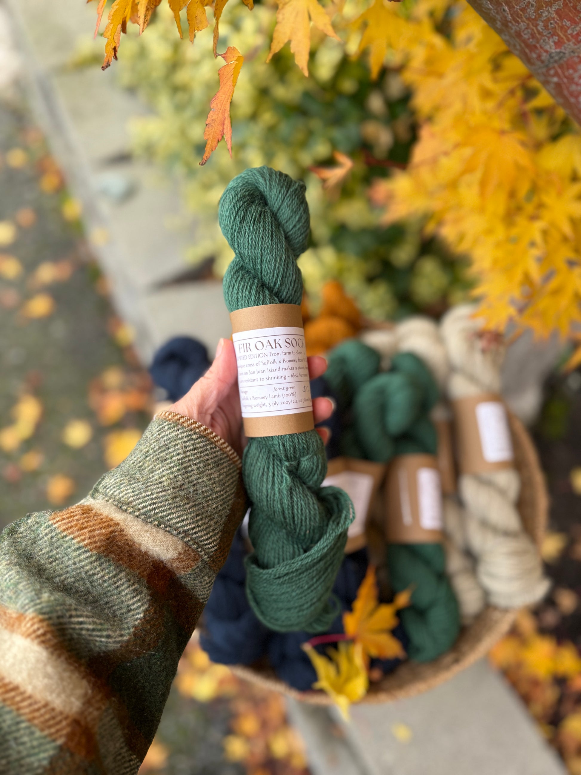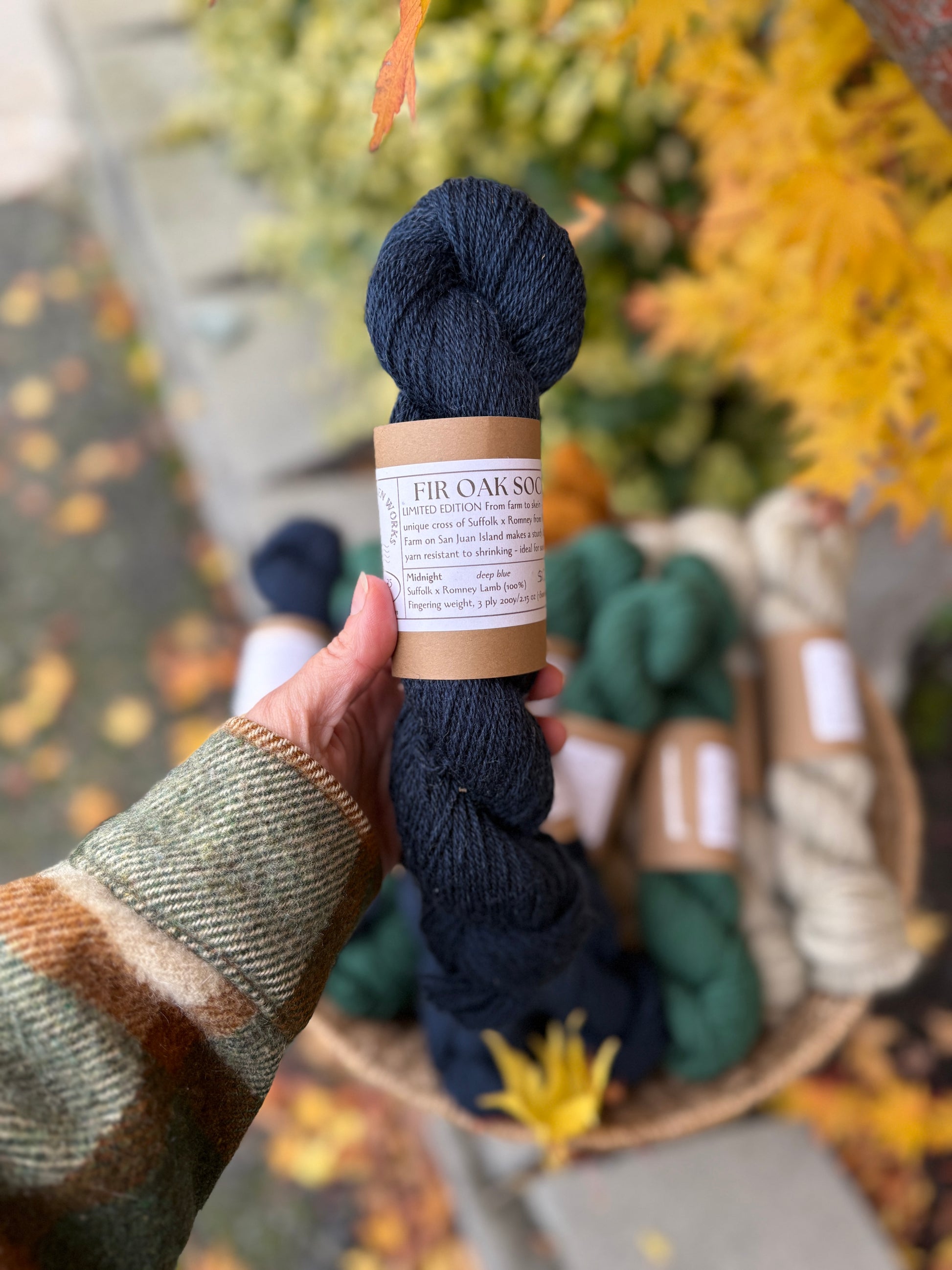Limited Edition. From farm to skein - a unique cross of Suffolk x Romney hailing from Fir Oak Farm on San Juan Island. It's a sturdy, bouncy yarn resistent to felting - ideal for socks! Four colors for the Autumn '25 collection: