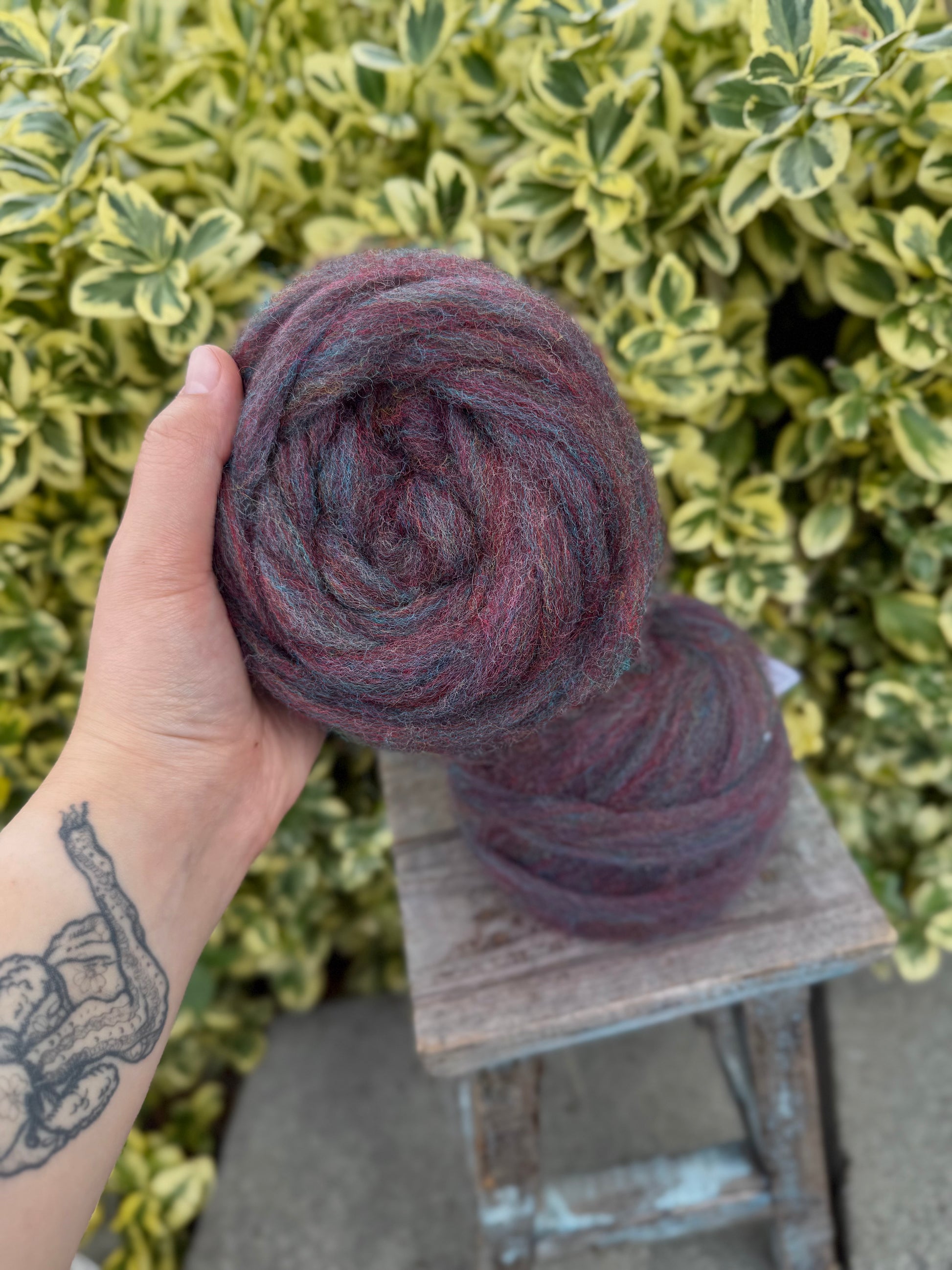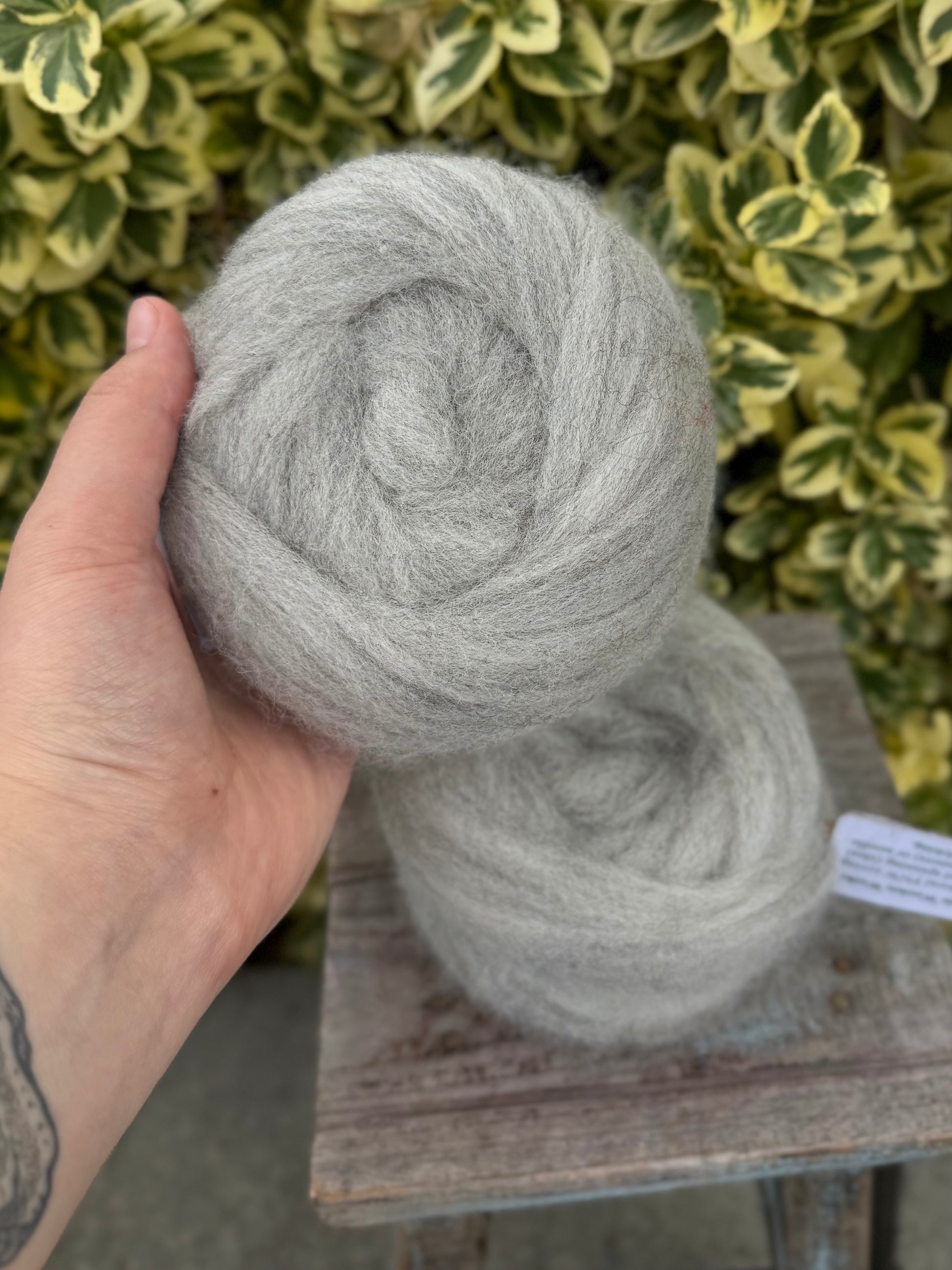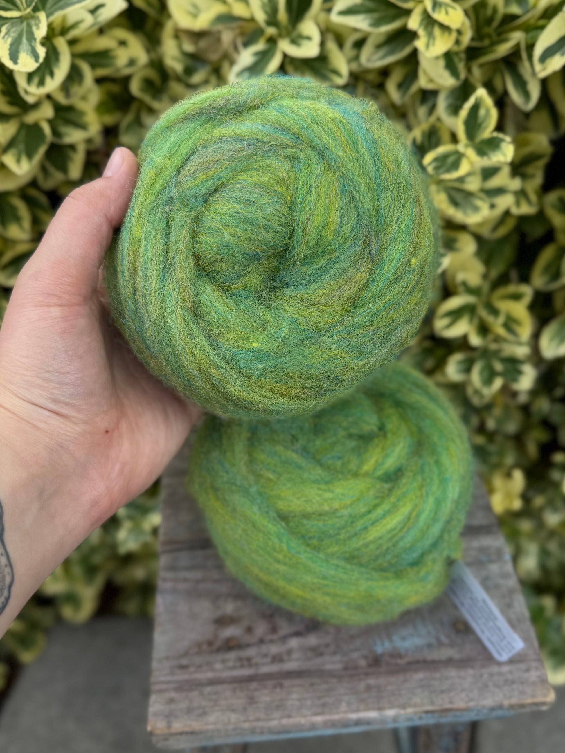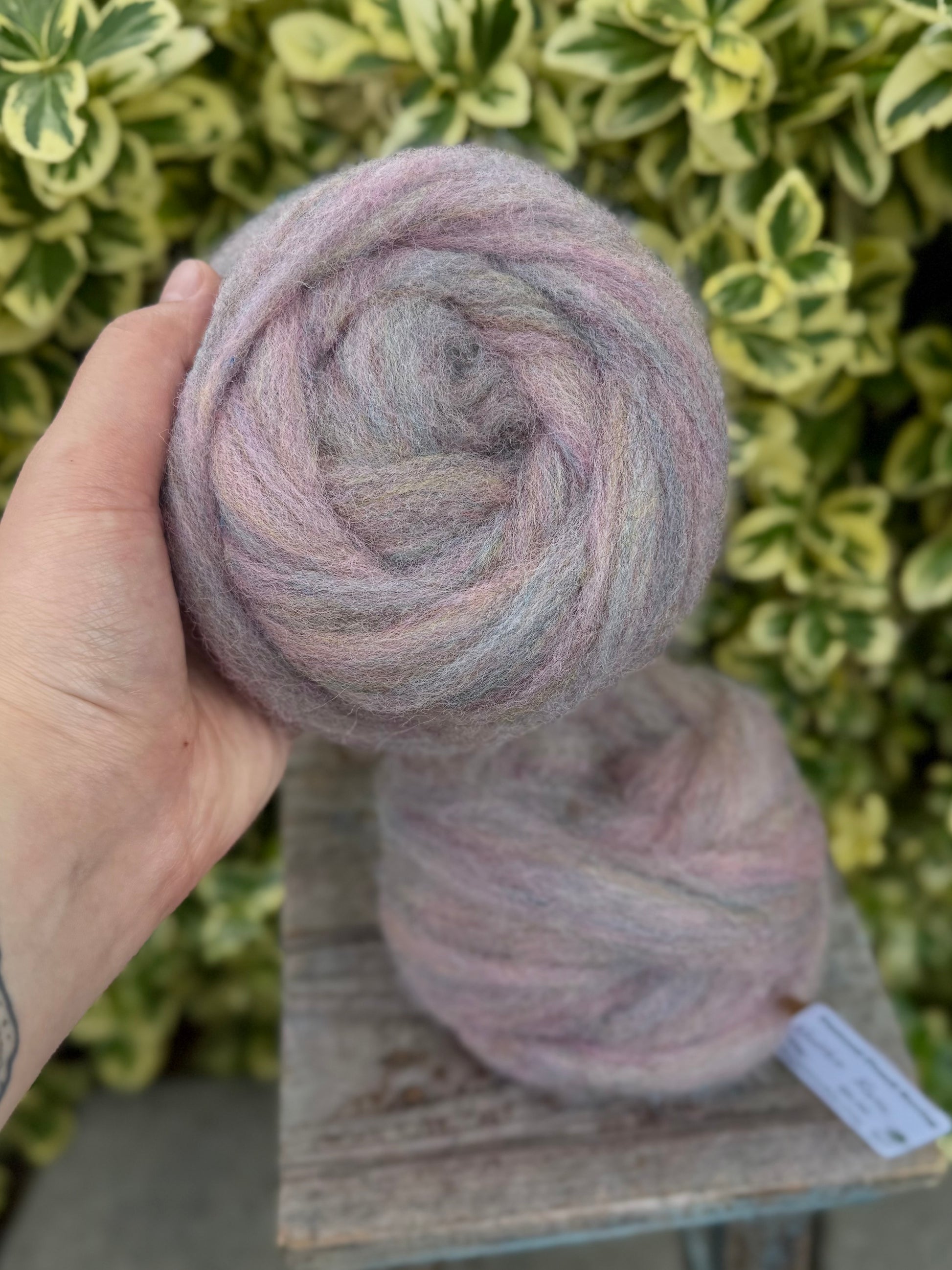 50g pencil roving. East Friesian wool, a dairy sheep flock from the Skagit Valley. Dyed in the locks, blended, and processed in the Skagit Valley. Great for handpinning and needle felting. The heathered colors make it a joy to spin, and newer spinners find it fun and easy to work with. Looking for a variety of colors to try? Check out our Rainbow Felting wreaths - 8 different colors to play with!
