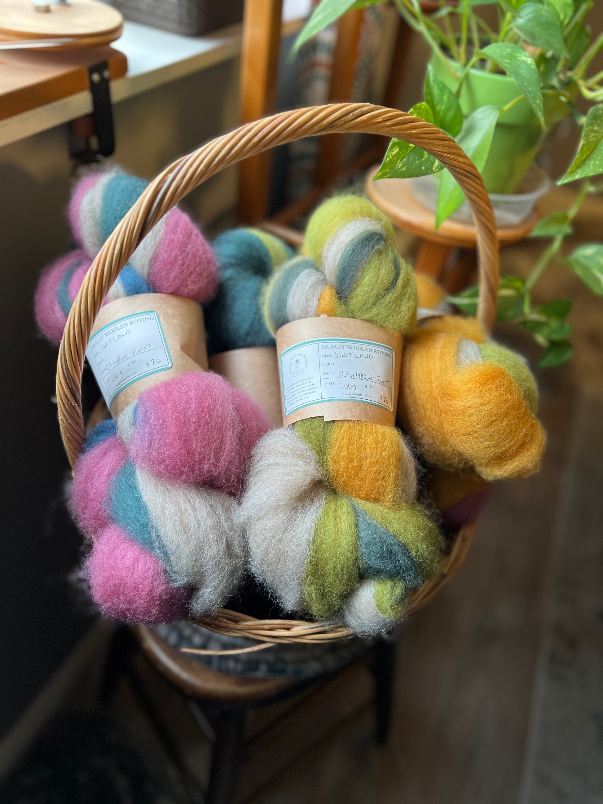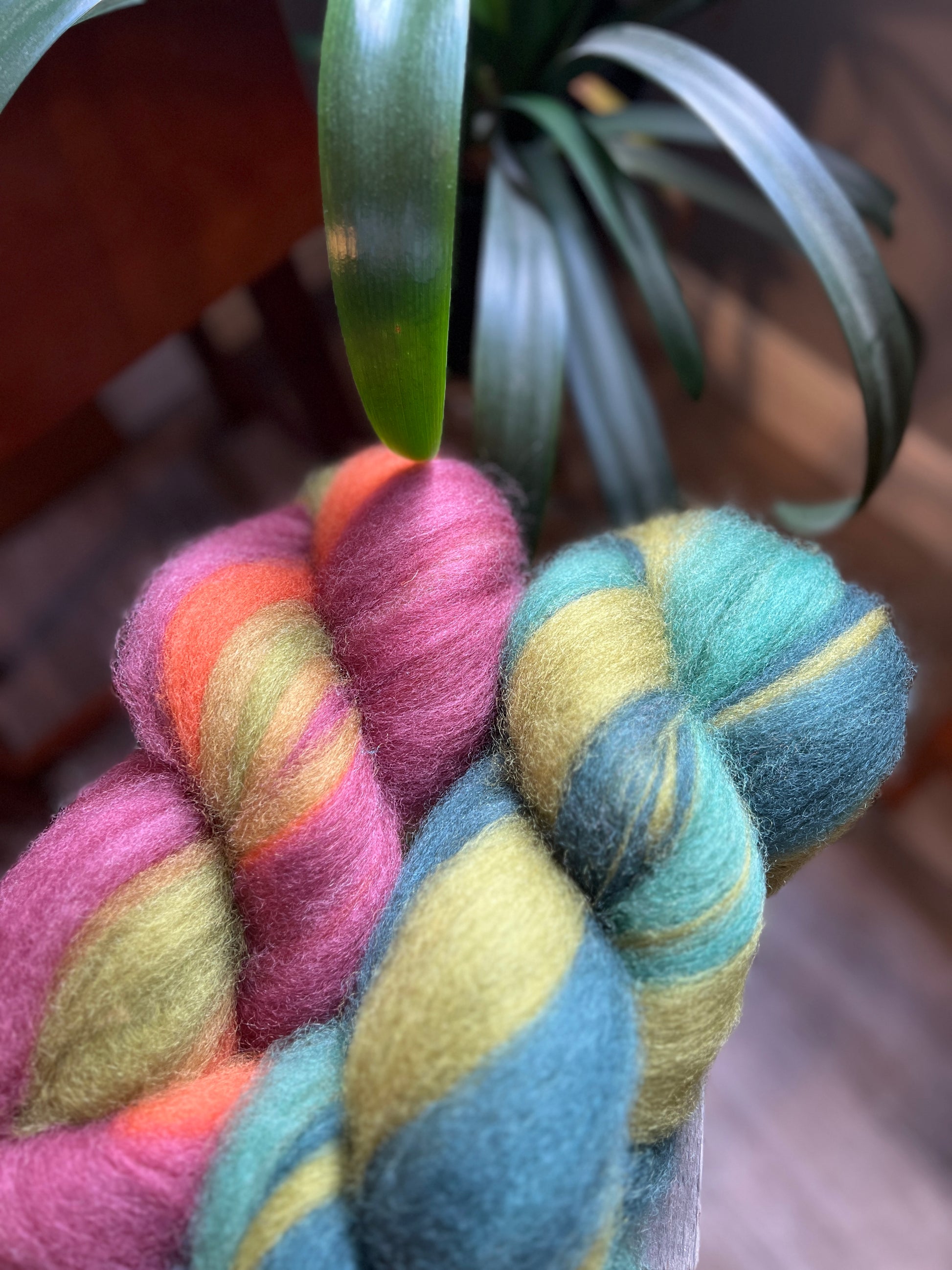 Colorful hanks of roving in 3-4 complementary colors. Each color is individual (not continuous), so you can blend or work with each color separately. Approximately 100g, available in East Friesian & Coopworth.