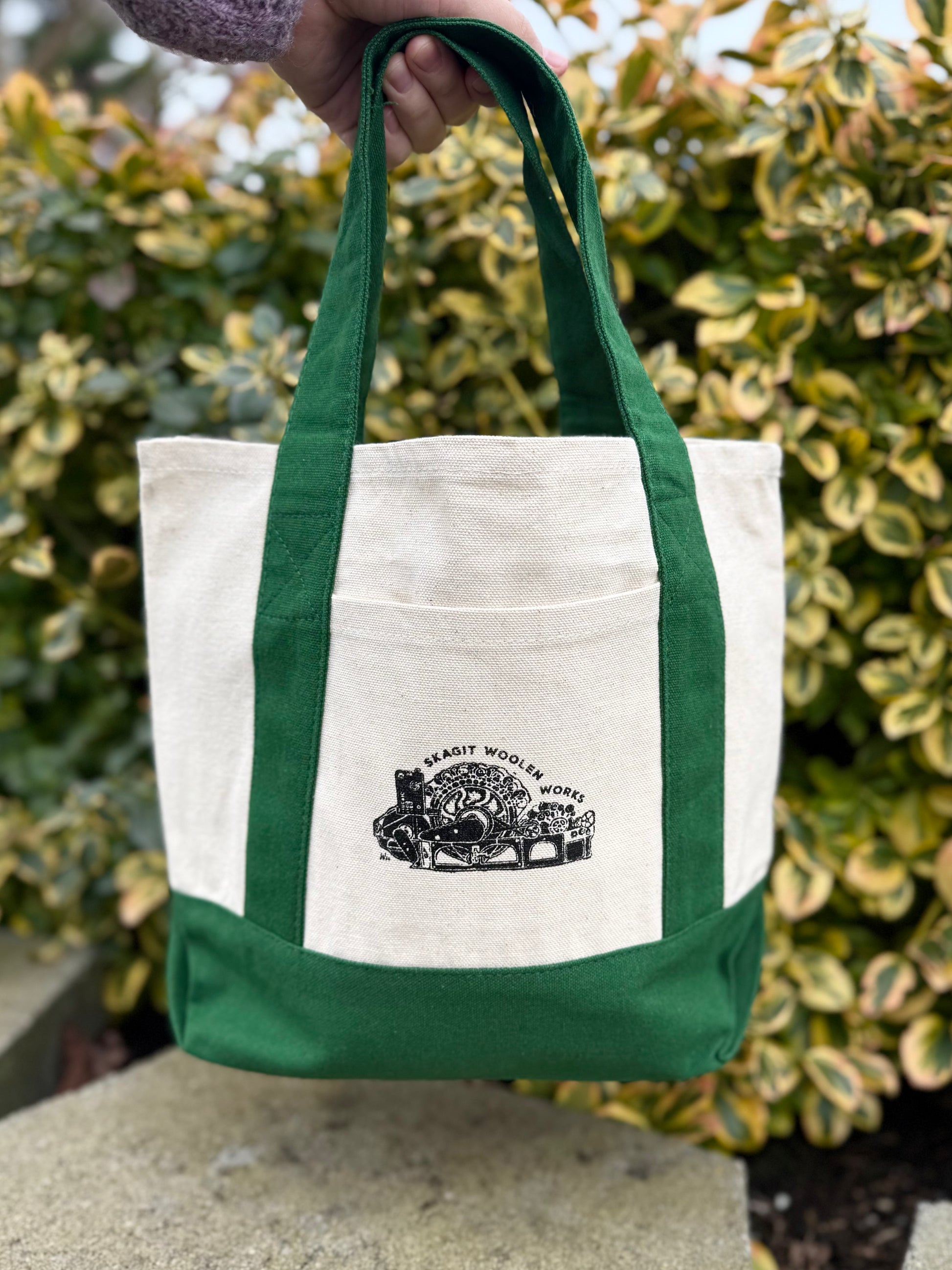 Friend of the mill and talented artist Kelly Blau created the carved print of our 103 year old Davis & Furber carder, lovingly named 'Rosie'. We now have two styles of bags to choose from! Zippered or shopping tote, both are high quality and a great way to show off your Rosie love.