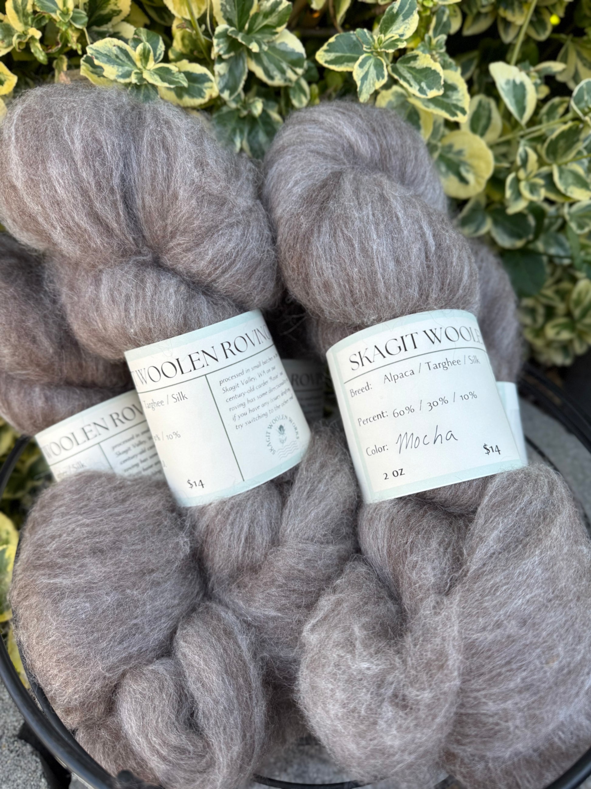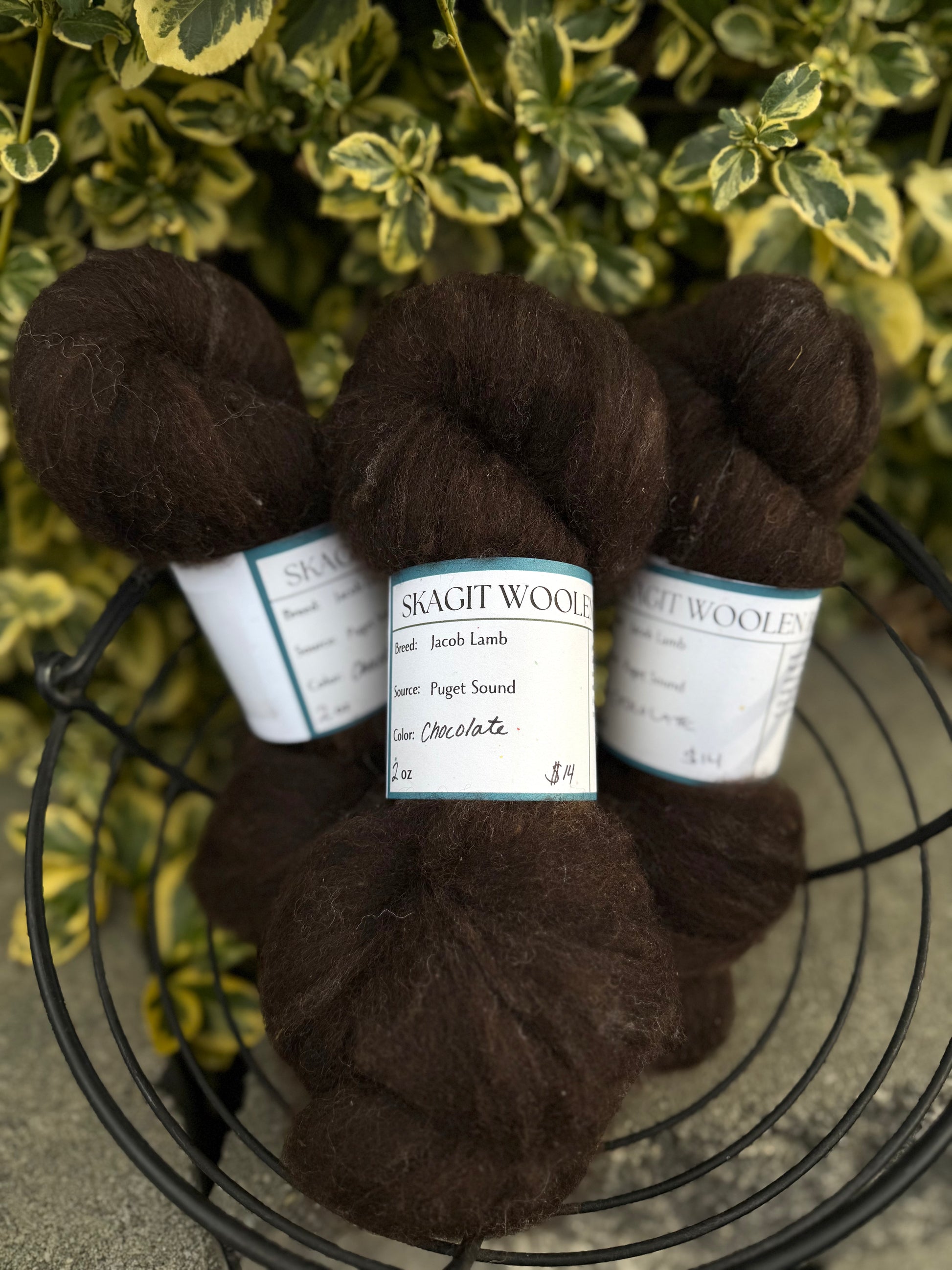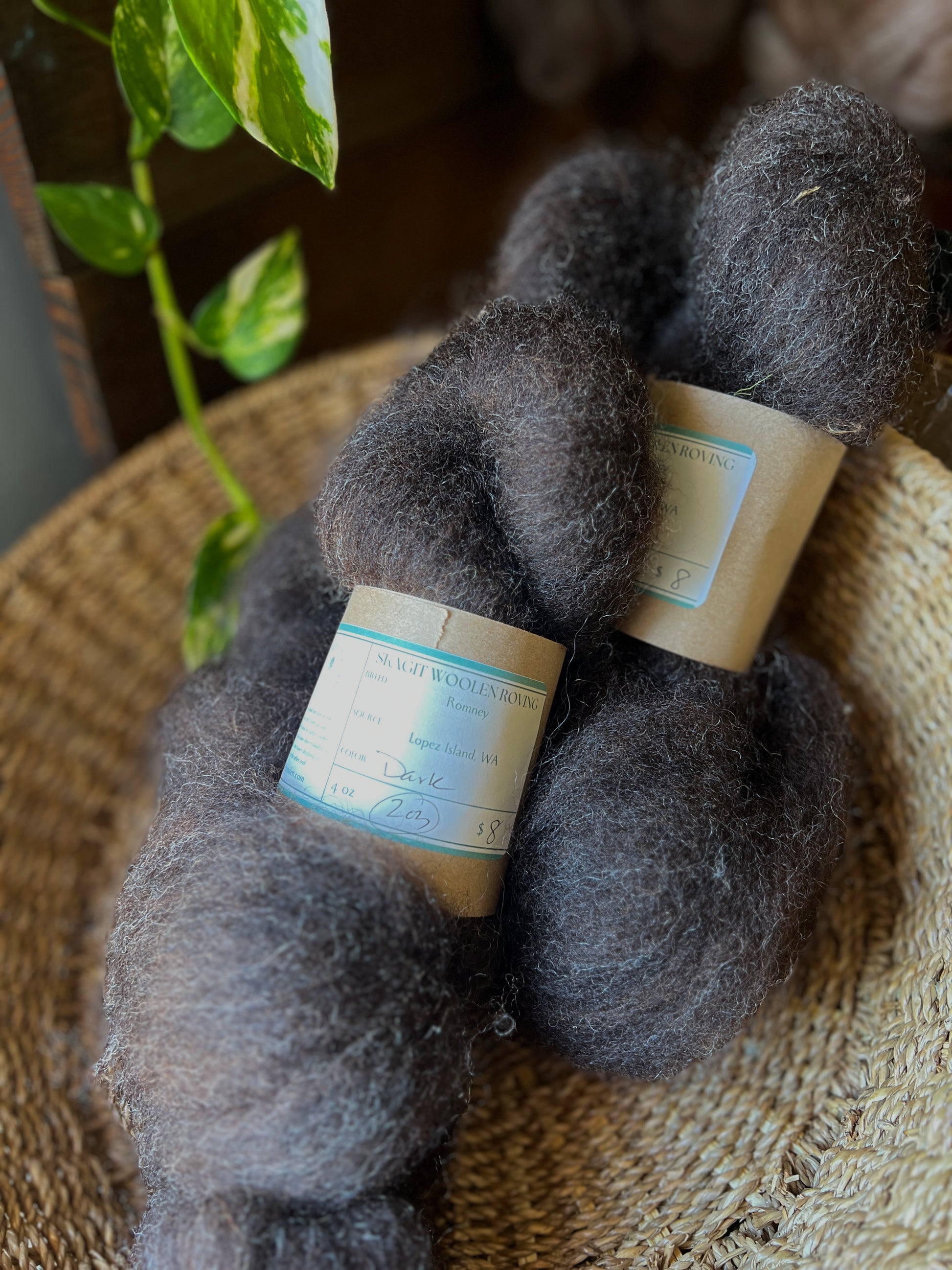 Island blends - sourced from the San Juan Islands, WA. The islands are known for their unique crosses which thrive there, and provide lovely, lustrous fleece. Dark brown blend of various crosses, including BLF, Romney, Coopworth, Finn, and East Friesian.