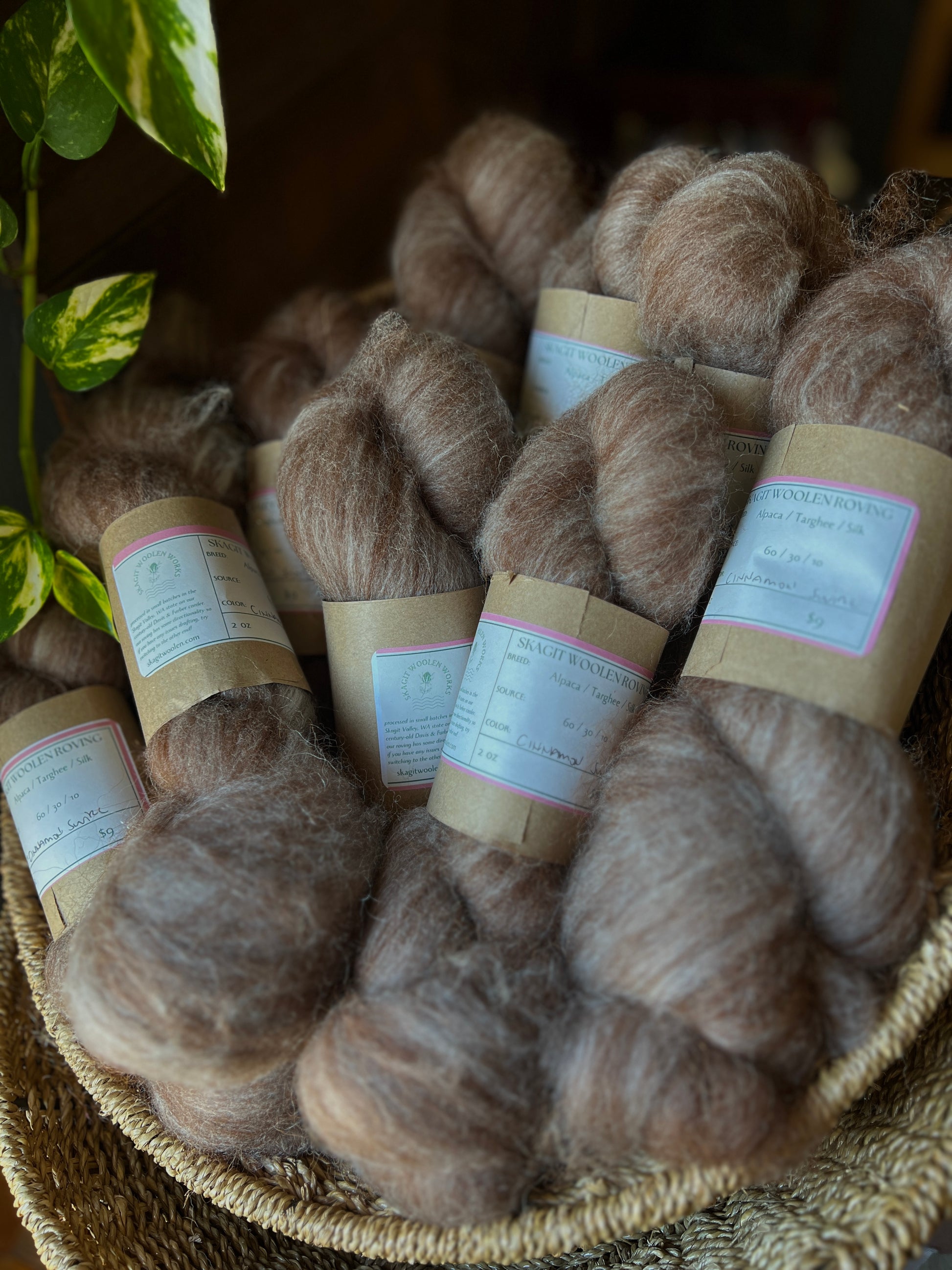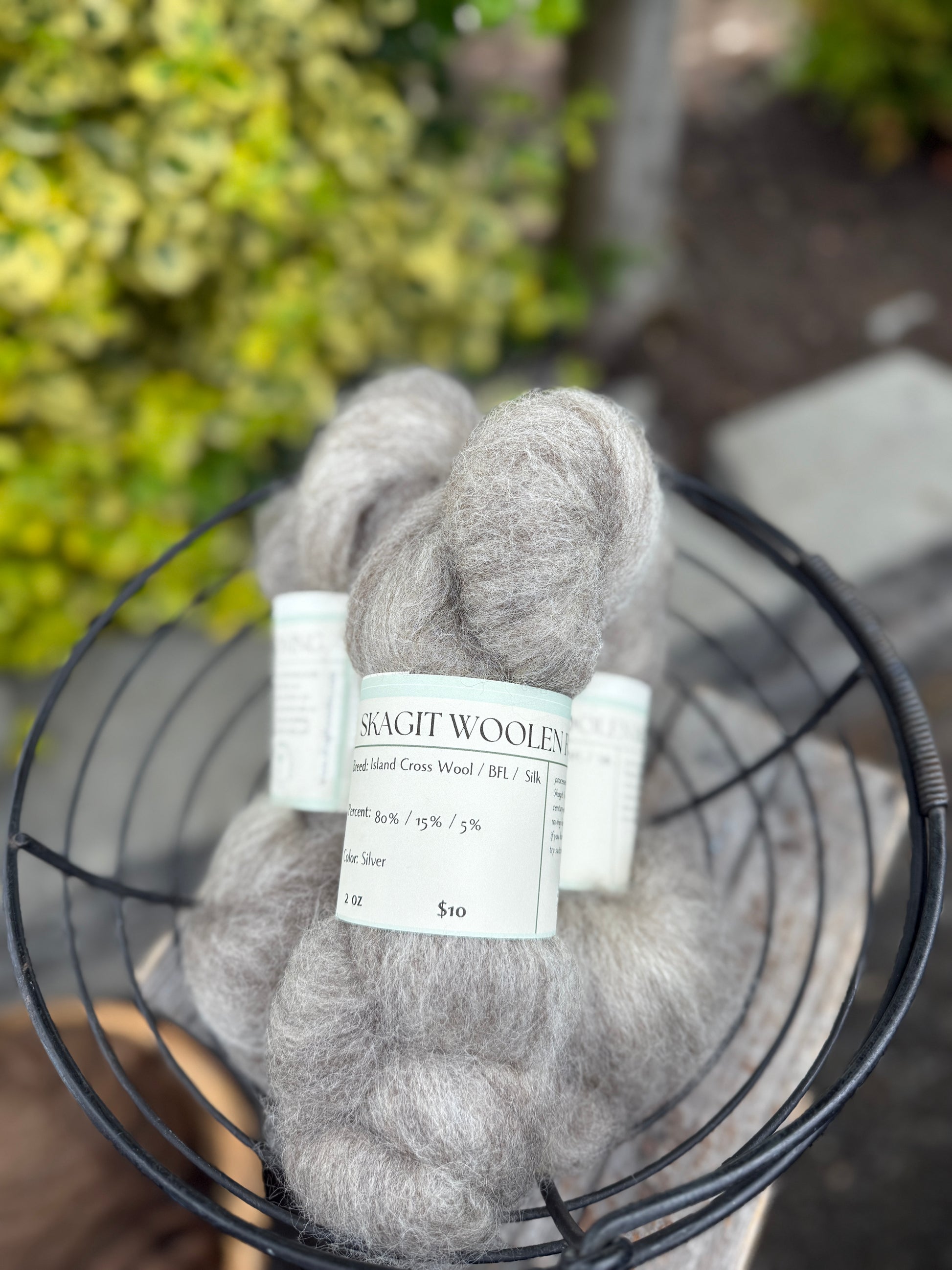 100% locally sourced and processed carded roving. 2 oz hanks. (If you order a larger amount and we have not skeined it yet, we may ship you the loose coil).