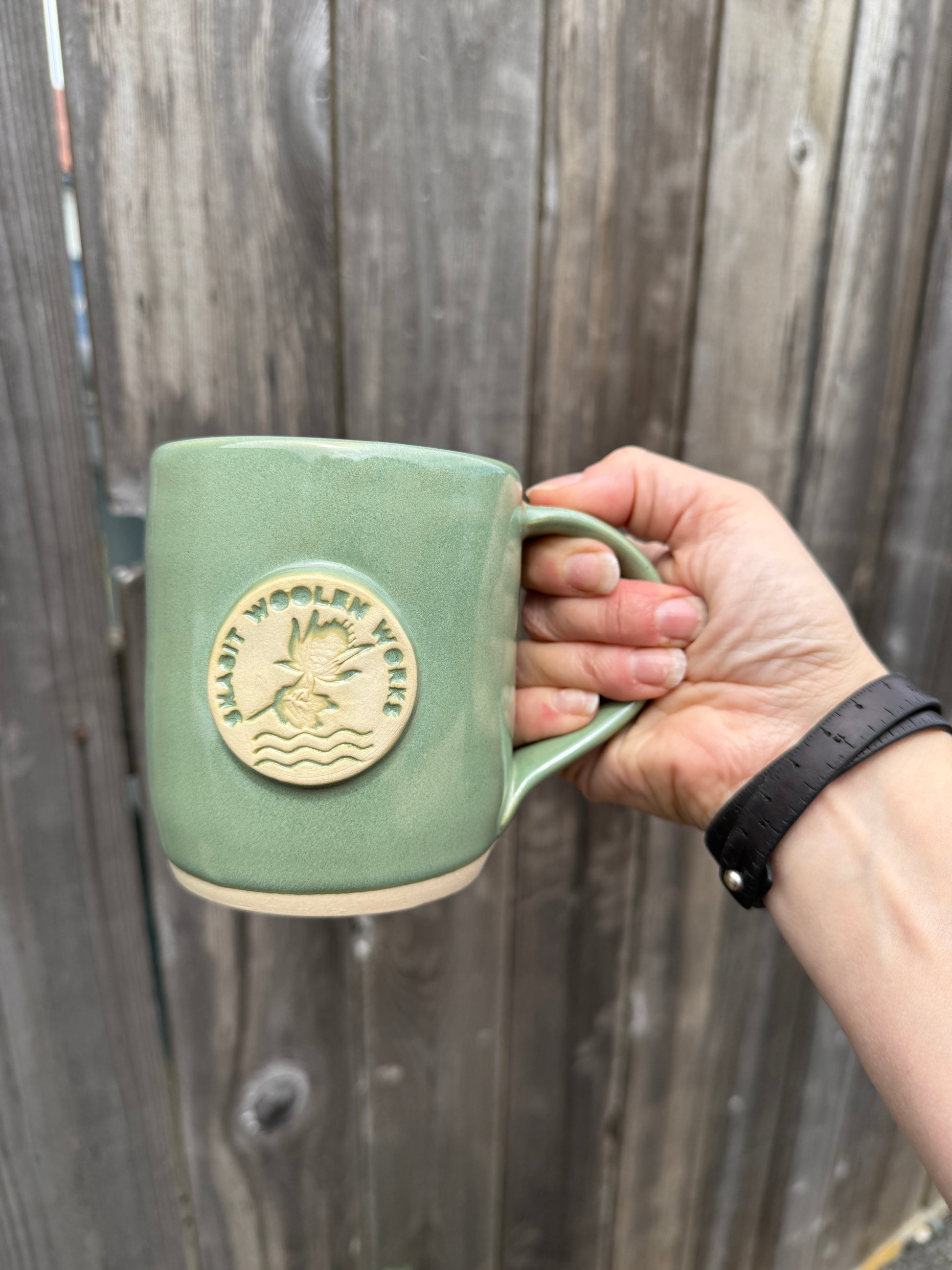 *The green mugs are listed as seconds due to the glaze not quite picking up all the details in the logo. But, as our friend Sarah says, they still hold coffee just fine!